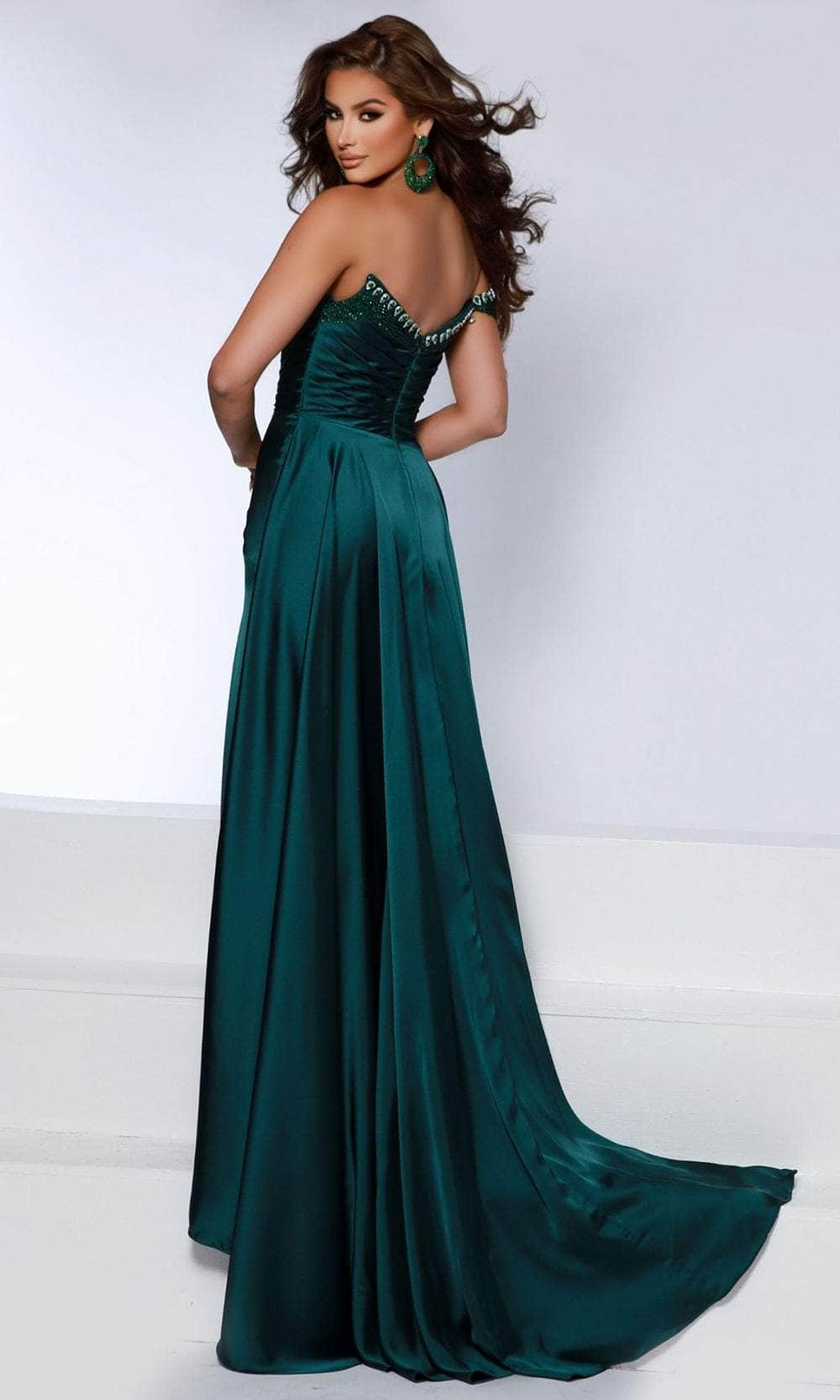 Unleash your inner enchantress in this creation by Johnathan Kayne 2898. This gown embraces the essence of glamour with its one-shoulder design and ruched detailing. It has beaded embellishments that add the right amount of sparkle to your look. Features are a sweetheart neckline, a single off-shoulder cap sleeve and a v-shaped open back. For a grandeur finish, the sheath skirt reveals a sexy thigh-high leg slit and A-line overskirt that spills to the sweeping train. Have a blast in this stylish Johnathan Kayne 2898 dress.