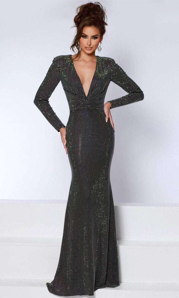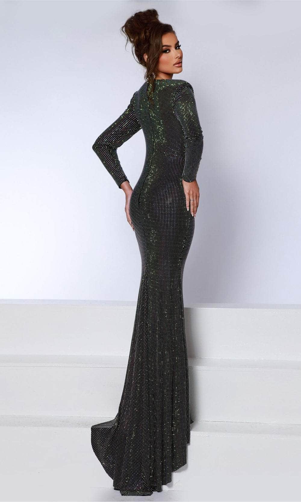 Glow with brilliance with the Johnathan Kayne 2901 masterpiece. Crafted with precision, it features impeccable tailoring and intricate rhinestone embellishments on a sleek jersey silhouette. Unveiling long sleeves and a dramatic plunging v-neckline, the gown boasts a full back and a dazzling, sculpted form that gracefully transitions into a mermaid skirt. The skirt gracefully sculpts and flares, culminating in a sweeping train. A radiant embodiment of sophistication, this Johnathan Kayne 2901 creation is meticulously designed to captivate and illuminate every moment with its timeless allure. Models are wearing the Black-AB, Black-Capri Blue, and Seafoam colors.