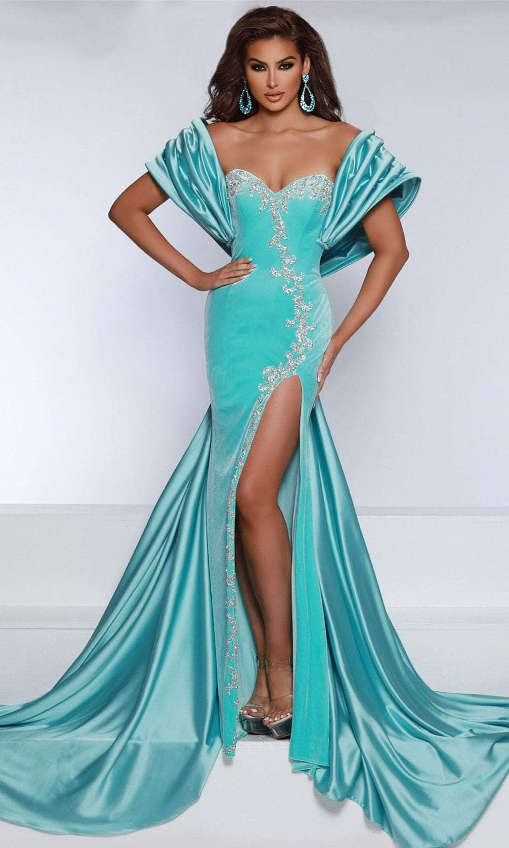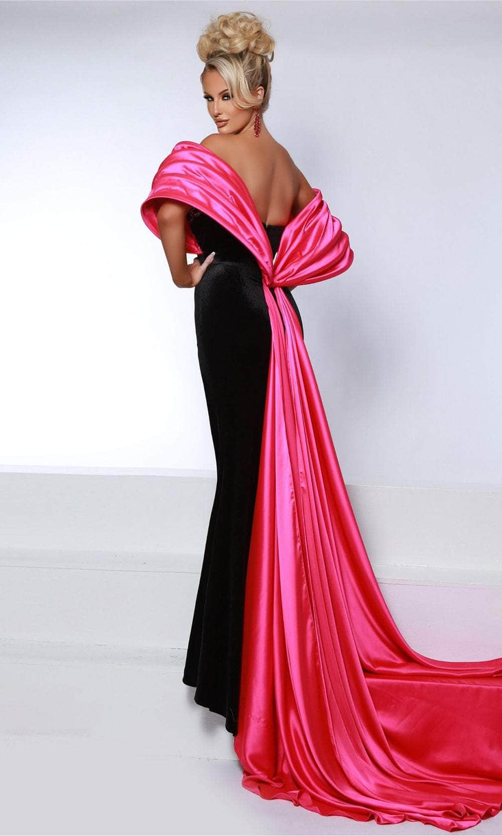 Immerse yourself in the allure of the Johnathan Kayne 2913 creation, a spellbinding masterpiece that exudes sophistication. This gown, adorned with lace appliques on a finely tailored stretch velvet silhouette, showcases a graceful sweetheart neckline. Elevating its allure, the midrise back and detachable bow add a touch of refinement, while the sheath skirt gracefully flows with a provocative slit, descending into a luxurious train. From head to toe, captivate observers with the opulent and sensuous design of the Johnathan Kayne 2913, a testament to timeless elegance and alluring charm. Models are wearing the Black-Hot Pink, Black-White, and Sky Blue colors