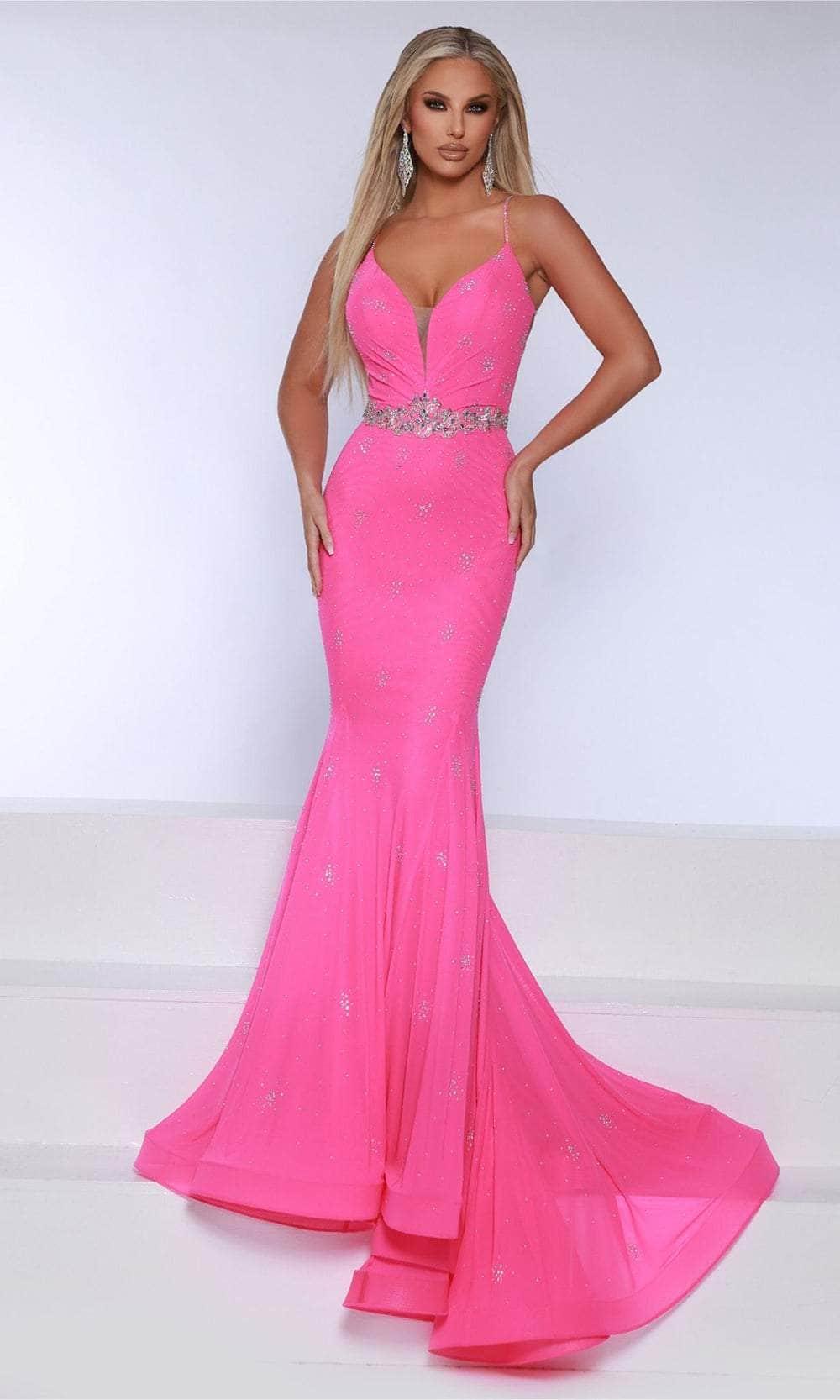 Walk the red carpet like a true star in this eye-catching masterpiece from Johnathan Kayne 3008. The sleeveless gown stuns with its fit and flare bodice ornamented with beautiful sparkle of beadings. With spaghetti straps framing the shoulders and a plunging V-neckline, this style also boasts an open back with a stylish strappy design. The mermaid skirt is accented with godets for added dramatic flair and volume. A structured horsehair hem and sweep train leave a lasting impression. You will exude breathtaking charm in this enchanting Johnathan Kayne 3008 gown. Models are wearing Coral, Hot Pink, and Royal colors.