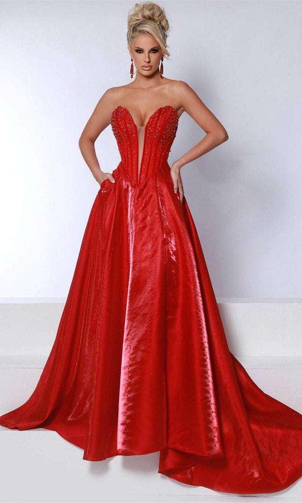 Make every step on the red carpet unforgettable in this Johnathan Kayne 3116 masterpiece. The strapless design features a corset bodice with exposed boning and sparkly crystal bead adornment that creates a sparkle, modern femininity. The plunging V-neckline with an illusion inset in the center offers subtle support, while the sultry open back is captivatingly secured by the concealed zipper closure. The ballgown skirt begins from the Basque waist and finishes with the sweep train that trails behind you like a dream, leaving a remarkable impression. The addition of hidden pockets completes the look, offering a convenient way to keep your stuff close. This Johnathan Kayne 3116 gown is breathtaking for prom or for any special event. Models are wearing Black, Red, Royal, and White colors.