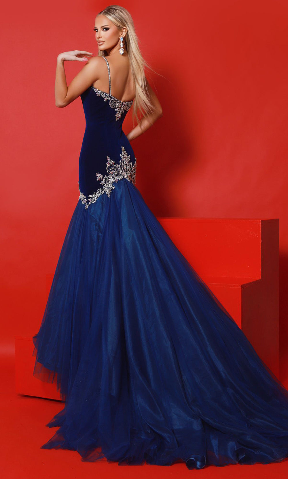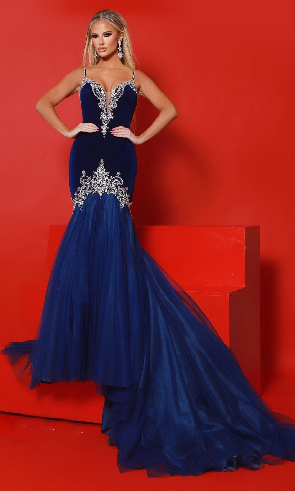Regal elegance takes shape in the unforgettable design of Johnathan Kayne 3148. This fit and flare silhouette features a plunging v-neckline supported by beaded spaghetti straps and transitions seamlessly into a dramatic sweep train. Elaborate beaded embellishments create captivating texture along the bodice and hips, accentuating curves and adding depth to the structured look. The gown flares at the bottom, forming a mermaid silhouette that balances glamour and grace. Johnathan Kayne 3148 delivers bold sophistication with timeless detail. Models are wearing Black, and Royal colors.