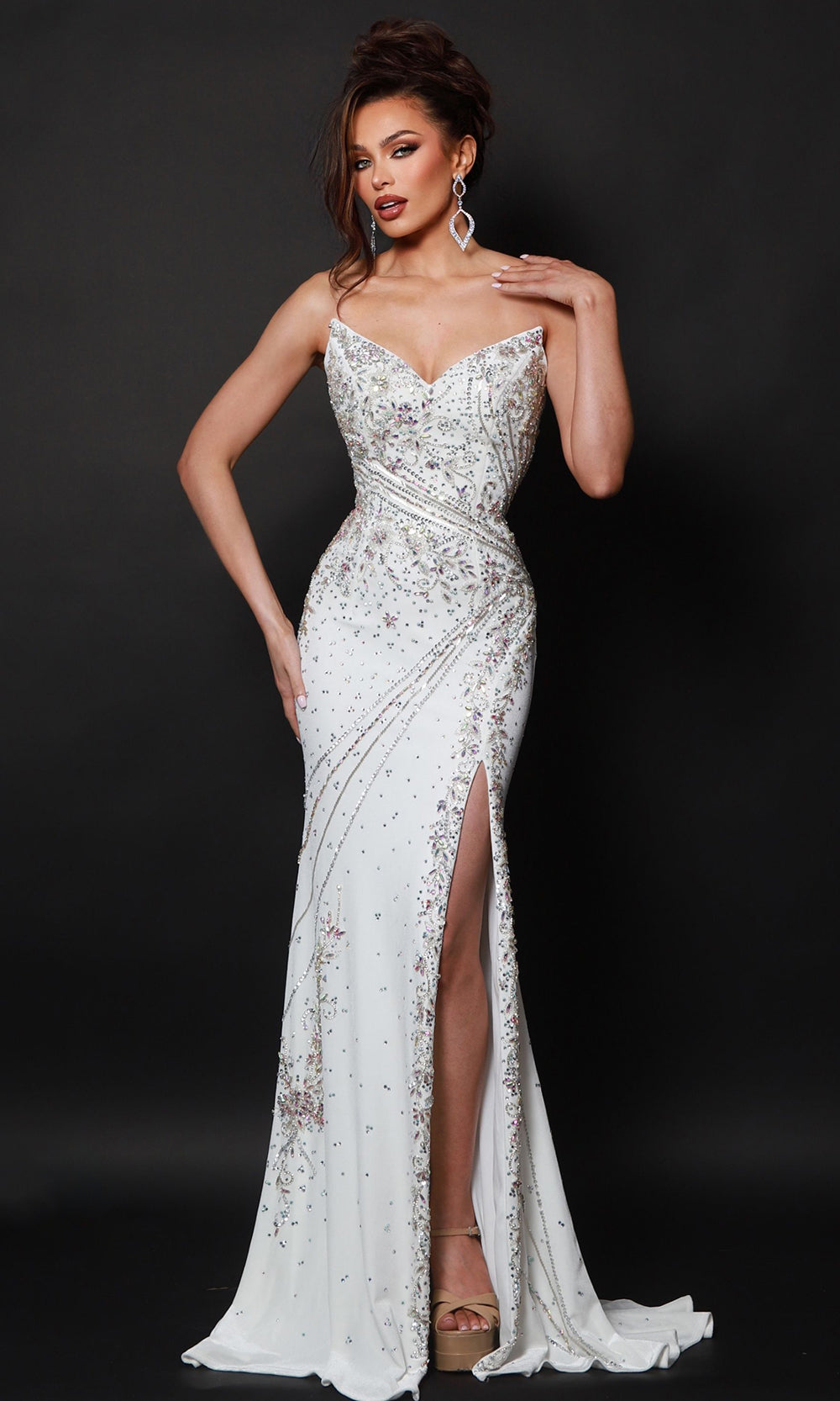 Radiate elegance in Johnathan Kayne 3208, a strapless sheath gown crafted in vibrant stretch velvet. The bodice features a peaked sweetheart neckline adorned with crystal detailing, creating a sculpted and glamorous focal point. Sleek through the hips, the silhouette opens into a daring thigh-high slit and finishes with a sweeping train for dramatic movement. Fully beaded for radiant sparkle, this gown is perfect for pageants, red-carpet entrances, or formal evenings. Johnathan Kayne 3208 ensures a show-stopping presence with timeless sophistication. Models are wearing Emerald, Royal, and White colors.