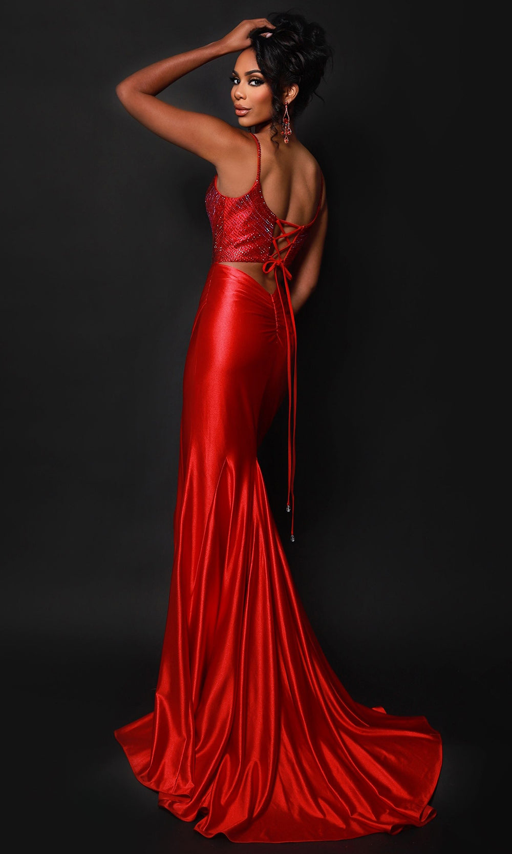 Step into pure confidence with Johnathan Kayne3218, a dazzling gown crafted in sleek stretch fabric. The plunging sweetheart neckline and sleeveless bodice shimmer with rhinestone beadwork, while ruching across the fitted hips sculpts a flattering silhouette. A daring high slit adds allure, balanced by a sweep train that glides with elegance. The cut-out mid-open back with lace-up closure completes the look with modern edge. Ideal for prom, galas, or pageant stages, Johnathan Kayne3218 ensures radiant sophistication. Models are wearing Black, Navy, and Red colors.