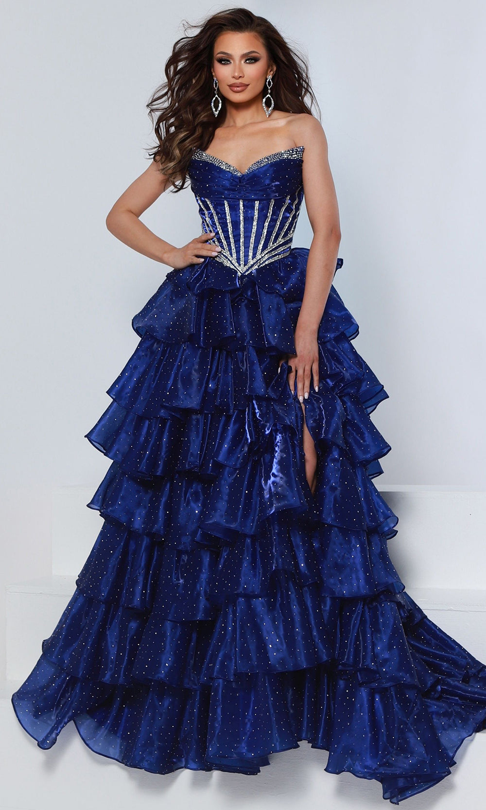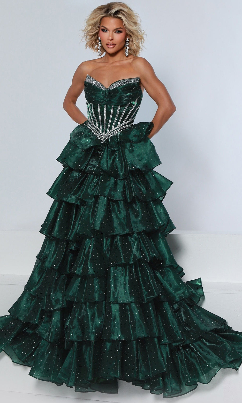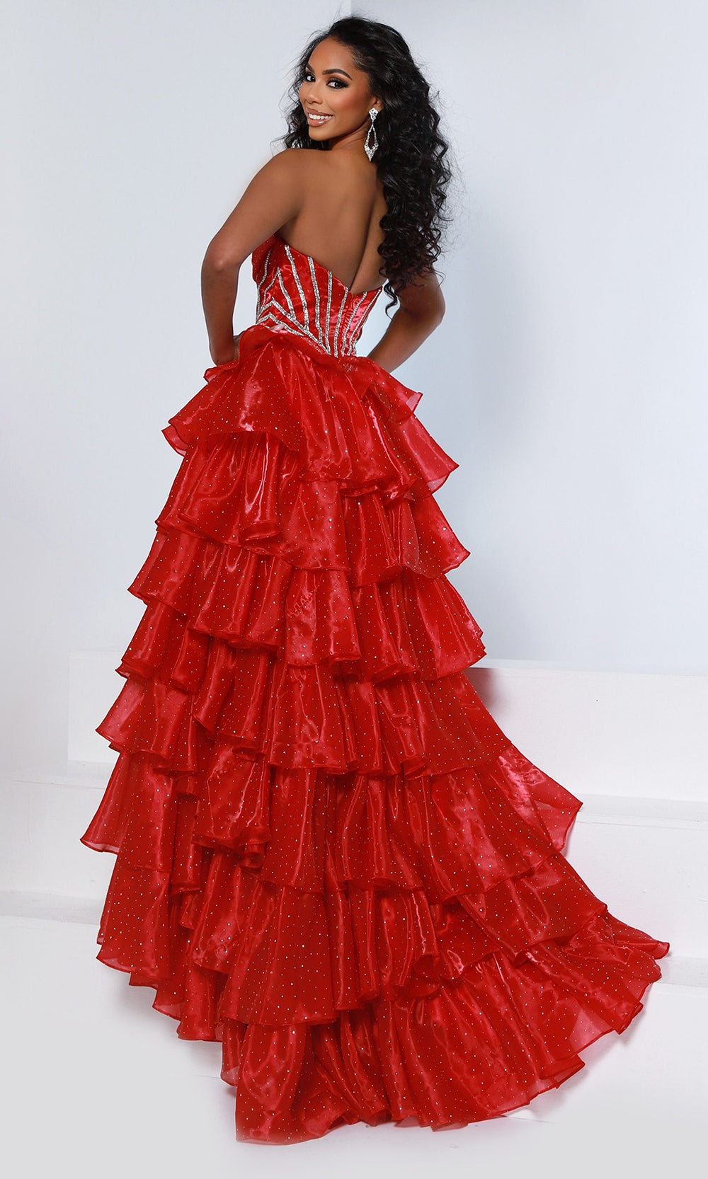 Make every moment unforgettable in Johnathan Kayne 3232, a breathtaking semi-ballgown designed for bold sophistication. The strapless beaded corset bodice glimmers with crystal accents, while playful tiered organza layers create dramatic volume. A thigh-high slit adds a flirty twist, complemented by a mid-open back and flowing train for regal movement. Ideal for prom, pageants, or homecoming celebrations, Johnathan Kayne 3232 is the ultimate gown for those who want to captivate the crowd with dazzling style. Models are wearing Cherry, Barbie Pink, Emerald, and Midnight colors.