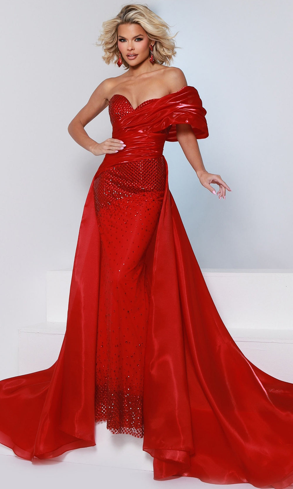 Step into couture brilliance with Johnathan Kayne 3243, a gown that radiates elegance and drama. The fitted sweetheart neckline and form-hugging bodice shimmer with beadwork, while a draped mirror organza wrap creates a chic one off-shoulder silhouette. Flowing seamlessly over the sheath skirt, the wrap extends into a voluminous overskirt with grand train, ensuring breathtaking movement. Perfect for pageant evening wear, prom nights, or homecoming court, Johnathan Kayne 3243 is designed to make every entrance unforgettable. Models are wearing Cherry, Black, Ice Blue, and White colors.