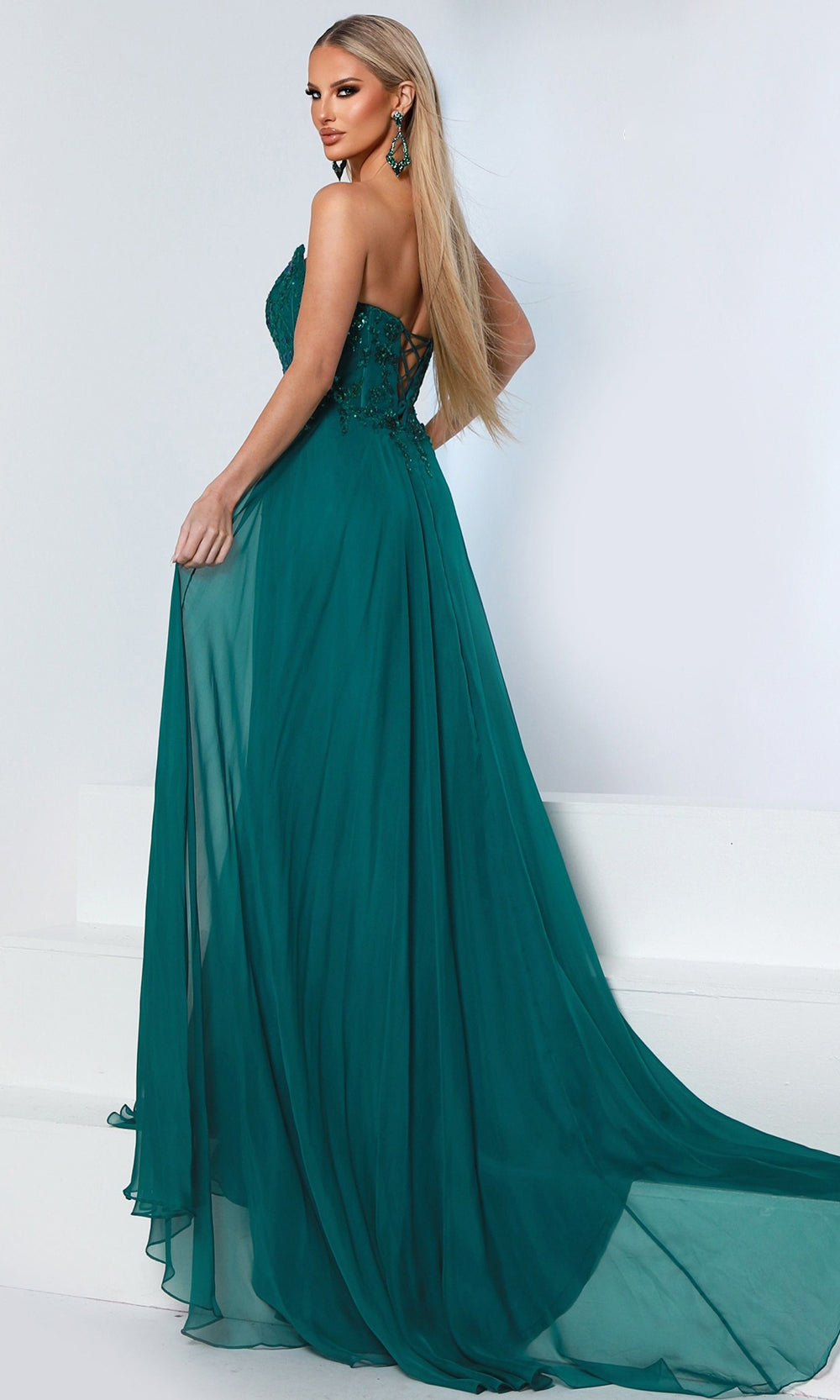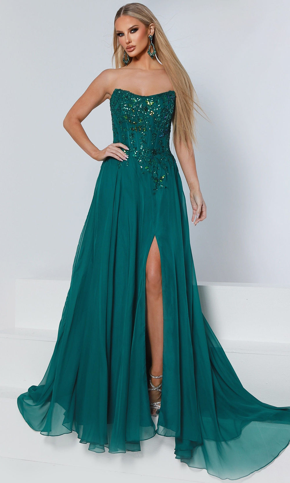 Step into a world of enchantment with Johnathan Kayne 3256, a gown that radiates effortless beauty in motion. This strapless A-line silhouette features a sequin lace applique corset bodice that sparkles with fairytale charm, while the flowing poly chiffon skirt adds graceful movement. A lace-up back and subtle leg slit bring a flirty twist, complemented by a sweeping train for dramatic elegance. Perfect for prom nights, teen pageants, or glamorous evening parties, Johnathan Kayne 3256 ensures you shine with unforgettable allure. Models are wearing Black, Emerald, Red, and Royal colors.