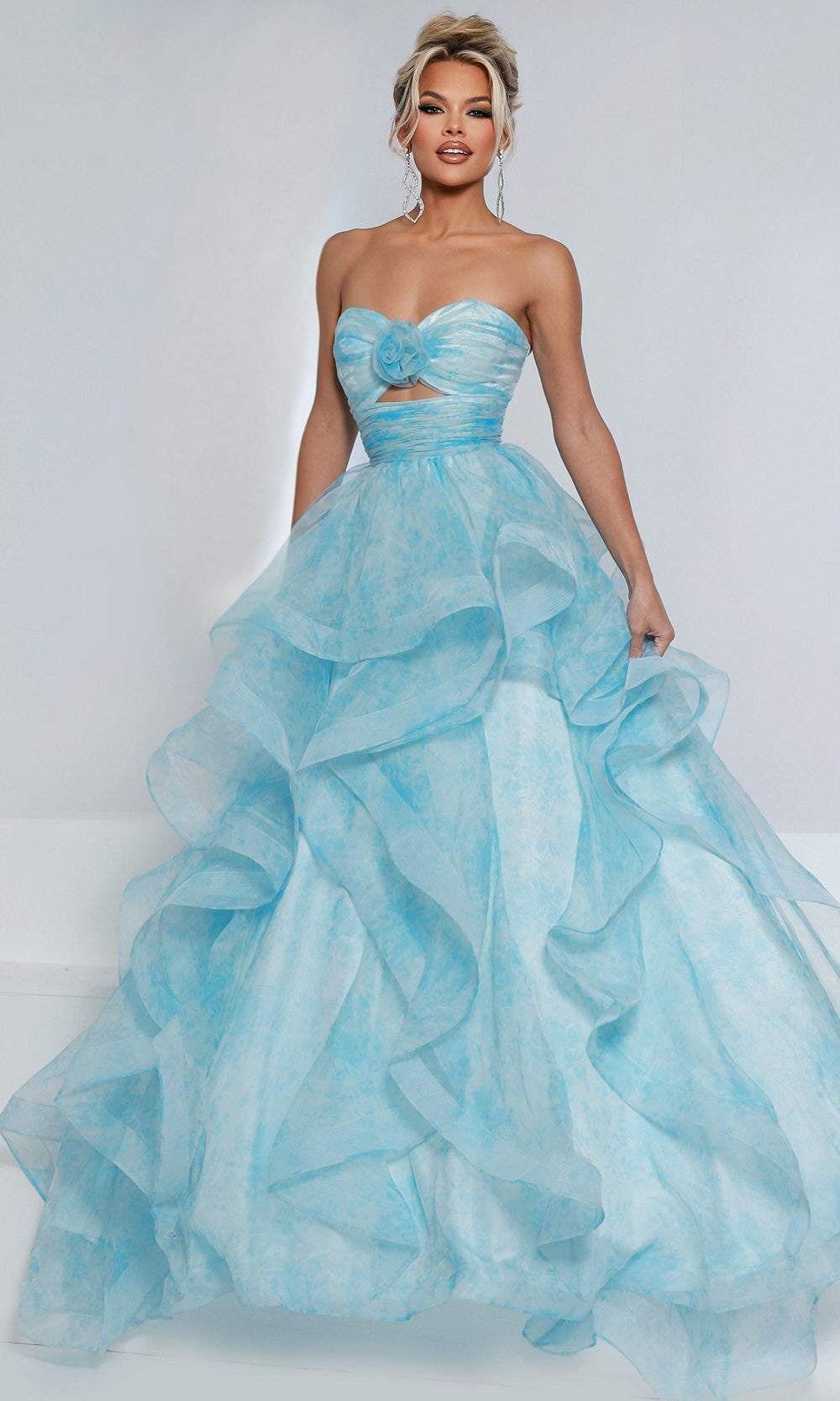 Romance comes alive with Johnathan Kayne 3271, a ballgown crafted for fairytale elegance. The sweetheart neckline frames a ruched bust adorned with a delicate rosette detail, while a tasteful cut?out below the bust adds modern charm. Cascading printed organza ruffles flow from waist to hem, finished with horsehair hems for dramatic volume and movement. Perfect for prom nights, pageant stages, or homecoming court, Johnathan Kayne 3271 ensures you’ll float across the room with grace and unforgettable sophistication. Models are wearing Blush, Sky Blue, and Yellow colors.