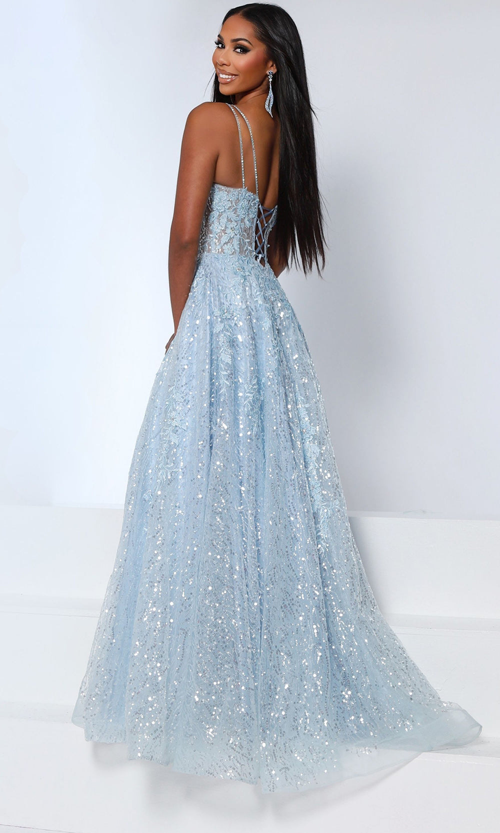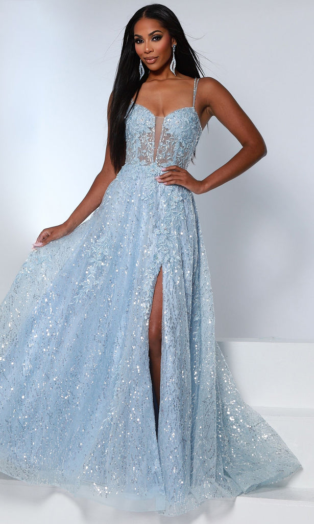 Delicate and divine, Johnathan Kayne 3277 shines with shimmering sequins and romantic lace details. The sheer corset bodice offers beautiful structure, while gentle ruching enhances the natural waist. A flowing A line skirt moves gracefully with every step, and the side slit adds a touch of modern charm. Finished with double straps, a lace up back, and a sweep train, this gown is perfect for unforgettable prom nights. Models are wearing Ice Blue, and Lilac colors.