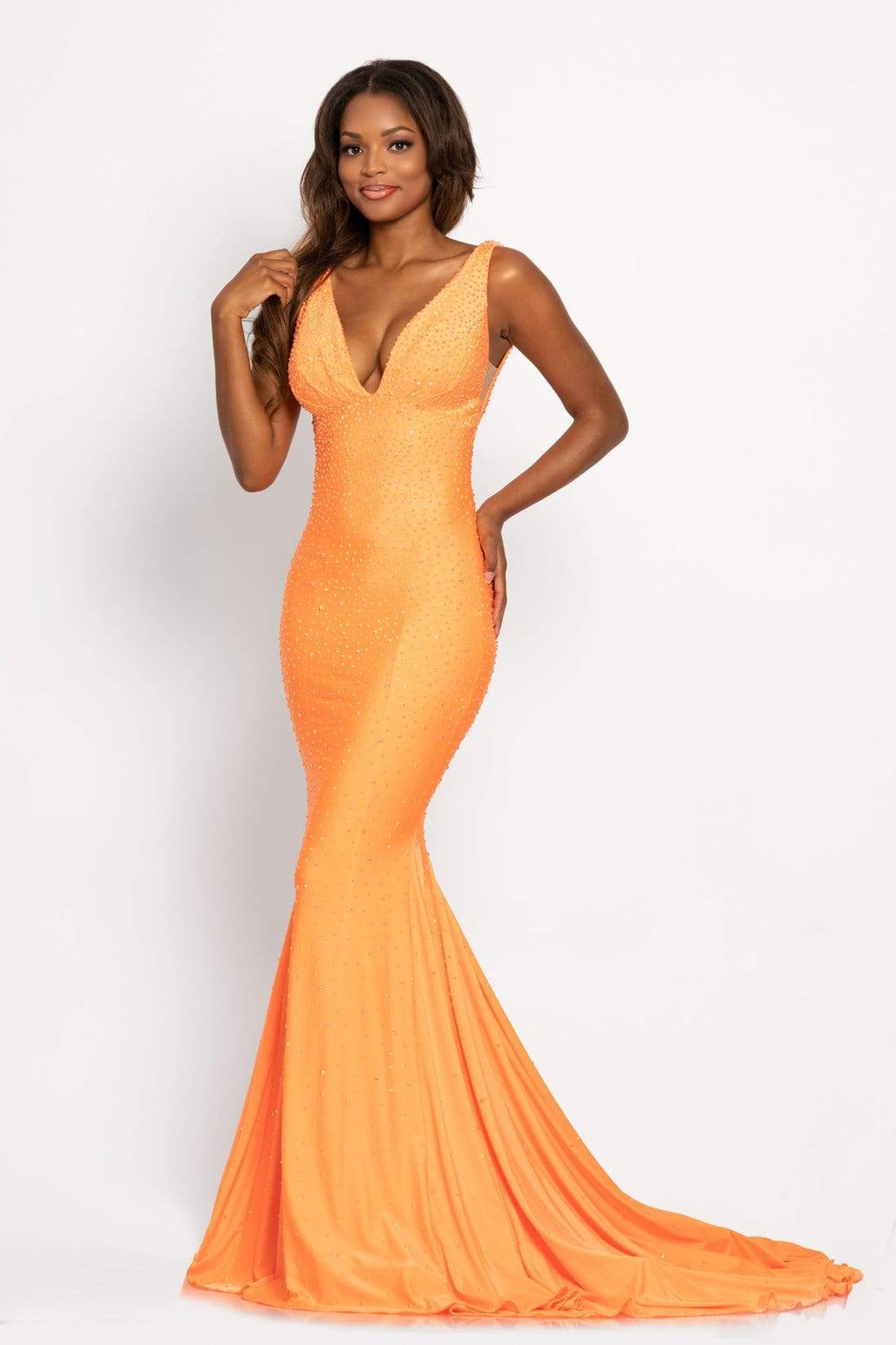You deserve to feel stunning when you don this designer's favorite gown, Johnathan Kayne 9213. A plunging V neckline bisects the sleeveless bodice, mirrored with an open V back. The whole ensemble has lavish crystal beadings throughout which has made it look more classy and sophisticated and of course more sparkling. The skirt attractively flares out from the knee down to a full length mermaid style skirt, completed with a dramatic sweep train. This Johnathan Kayne dress is sure to give you a head turning look and make you the star of the night.