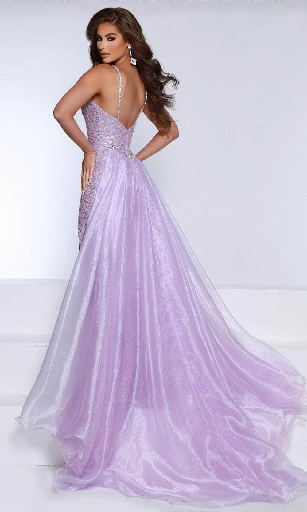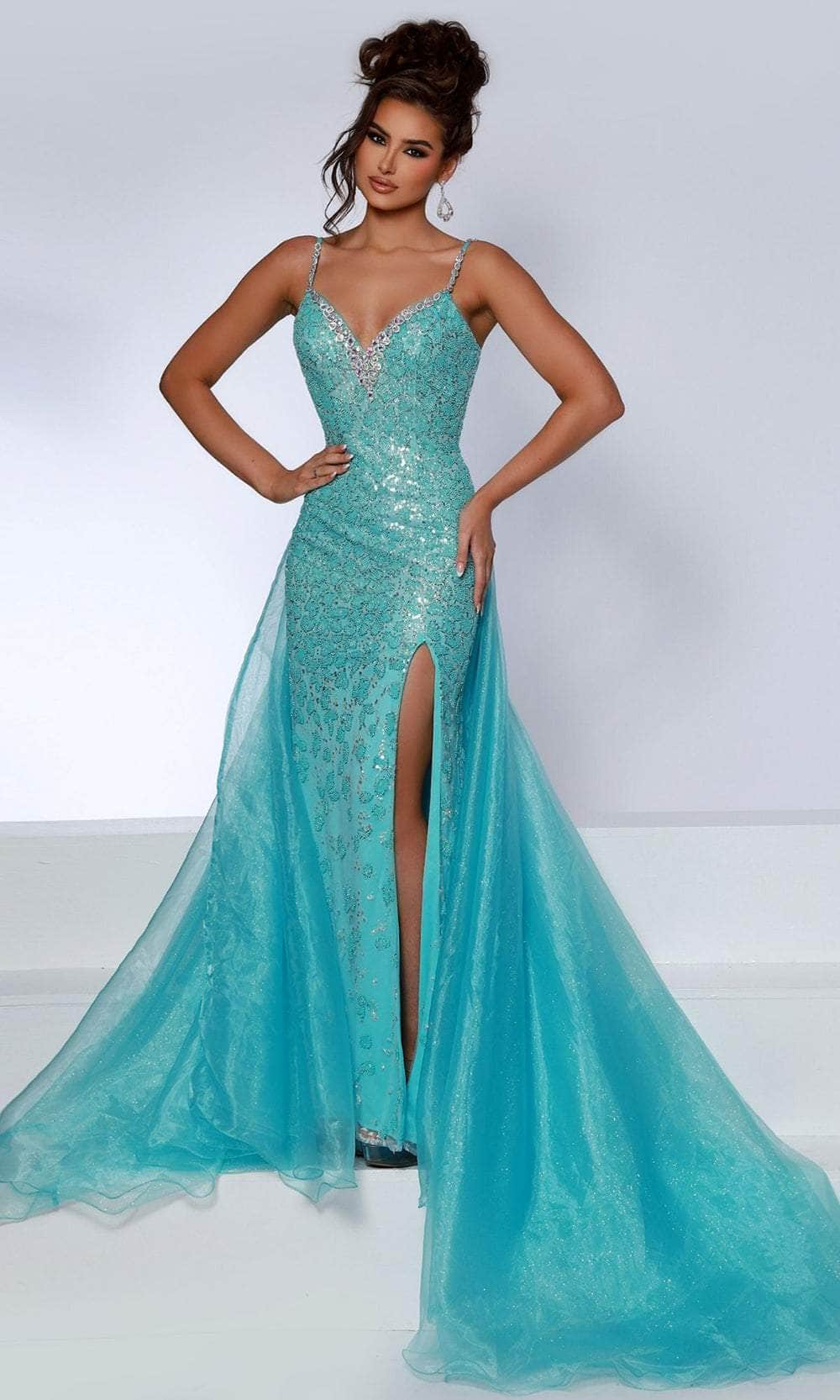 Unveil your inner elegance with the stunning Johnathan Kayne DKS2 evening gown, designed to make a lasting impression. Crafted from beaded glitter mesh and stretch lining, this gown elegantly contours your figure, exuding both sophistication and allure. Delicate spaghetti straps adorned with intricate beadwork lead into a deep v-neckline, adding a refined touch. The midrise back, featuring a concealed zipper closure, ensures a flawless fit. With a sheath silhouette, high slit, and full-length hem, this gown combines style and drama effortlessly. A sheer organza back panel cascading into a sweep train completes this breathtaking design. Make an unforgettable entrance with the unparalleled elegance of the Johnathan Kayne DKS2. Models are wearing the Aqua and Lilac colors.