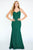 Rendered in a glitter jersey silhouette, this dress showcases a fitted bodice stringed with double spaghetti straps. A spectacle of strappy details crisscross the open back. The mermaid silhouette emphasizes every natural curve and flares down from the knees into a train. Model is wearing the Hunter color.