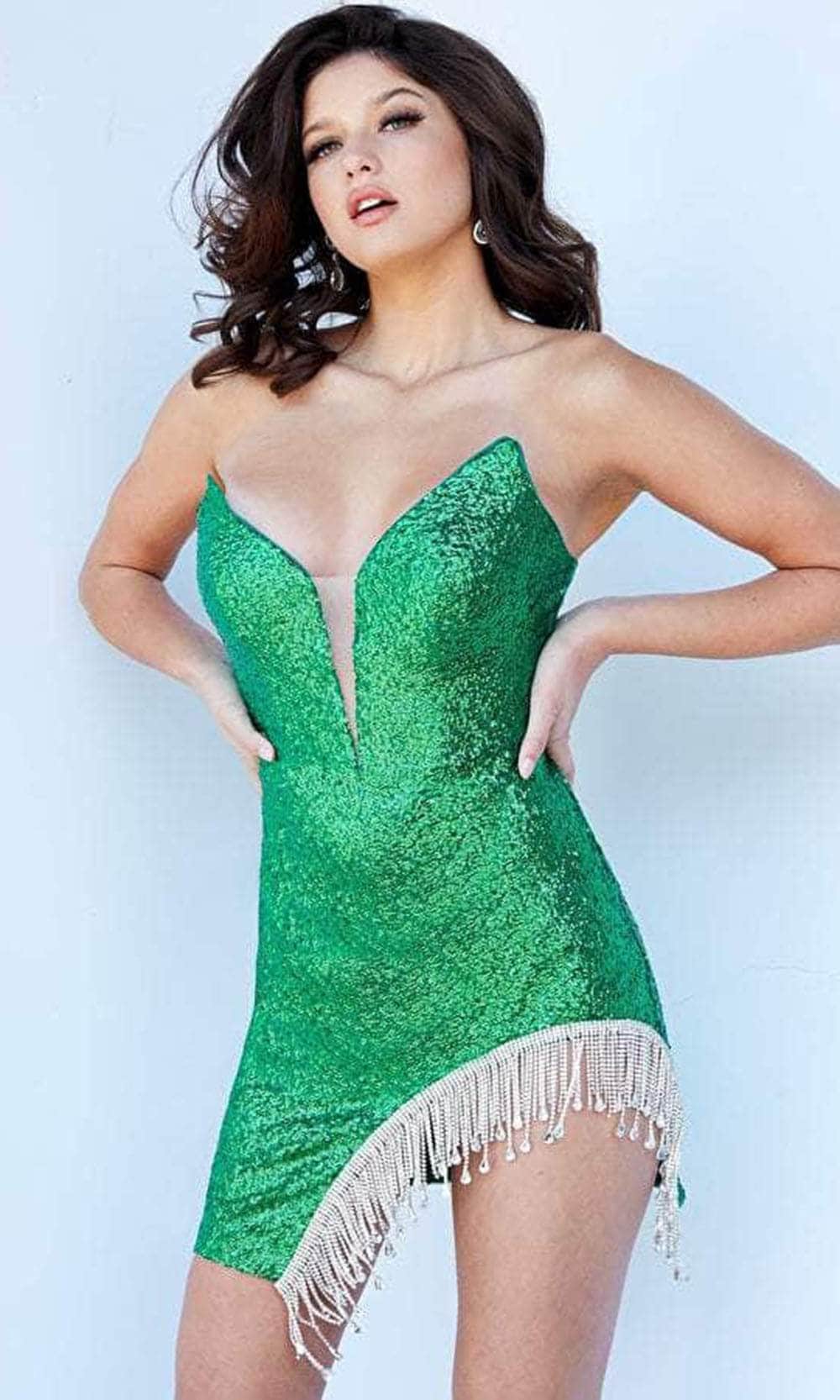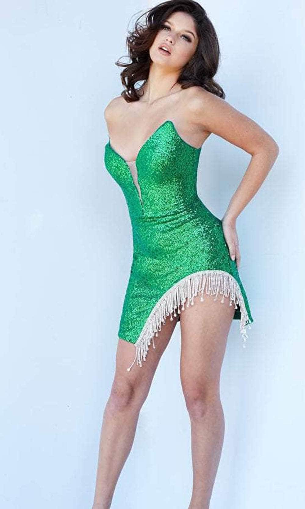 Glam up the night when you wear this fabulous cocktail dress by Jovani 000344. Styled in a bold plunging neckline with mesh inset, this strapless fitted bodice is crafted in a fully sequined fabric. Radiates in a mid-open back with zipper closure as the skirt flares glamorously to a short hemline with dangling fringes. This Jovani design is sure to be an attention-grabber in at the Prom, homecoming and other special events! model is wearing the Green color.