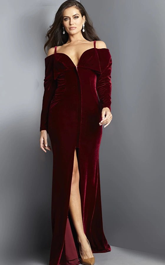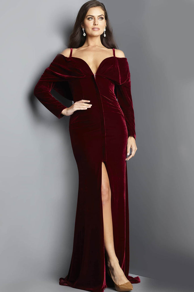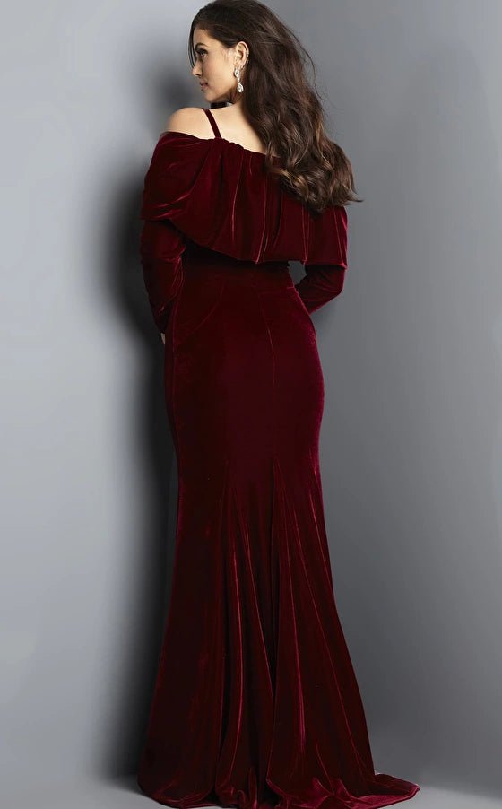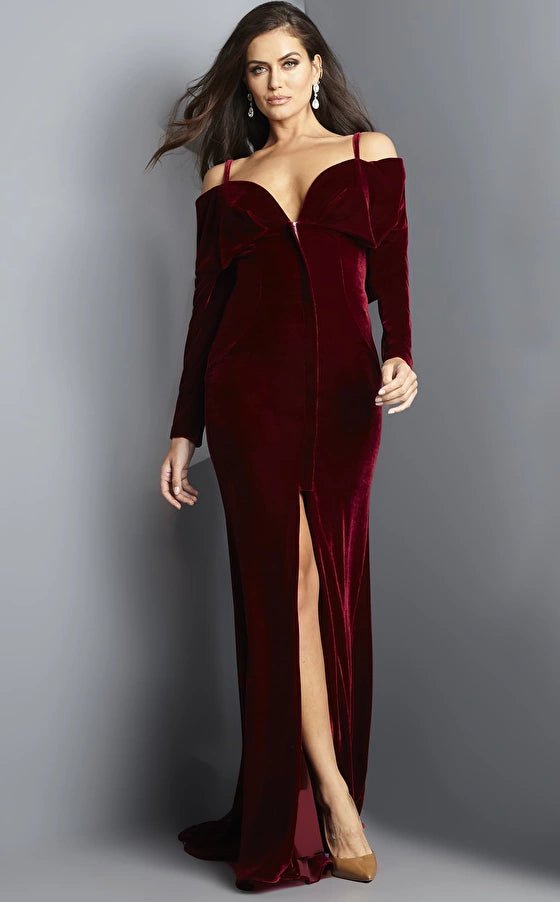 Exude a charm meant to mesmerize the elite crowd in this gorgeously decadent gown by Jovani 000350. Have a blast wearing this lovely gown featuring an off-shoulder neckline, long sleeves with a cape collar at the back, and thin straps. This dress highlight the zipper front detail that will surely be an eye-catcher. Look your absolute best and create a night you will never forget with this Jovani creation. Model is wearing a Burgundy color.