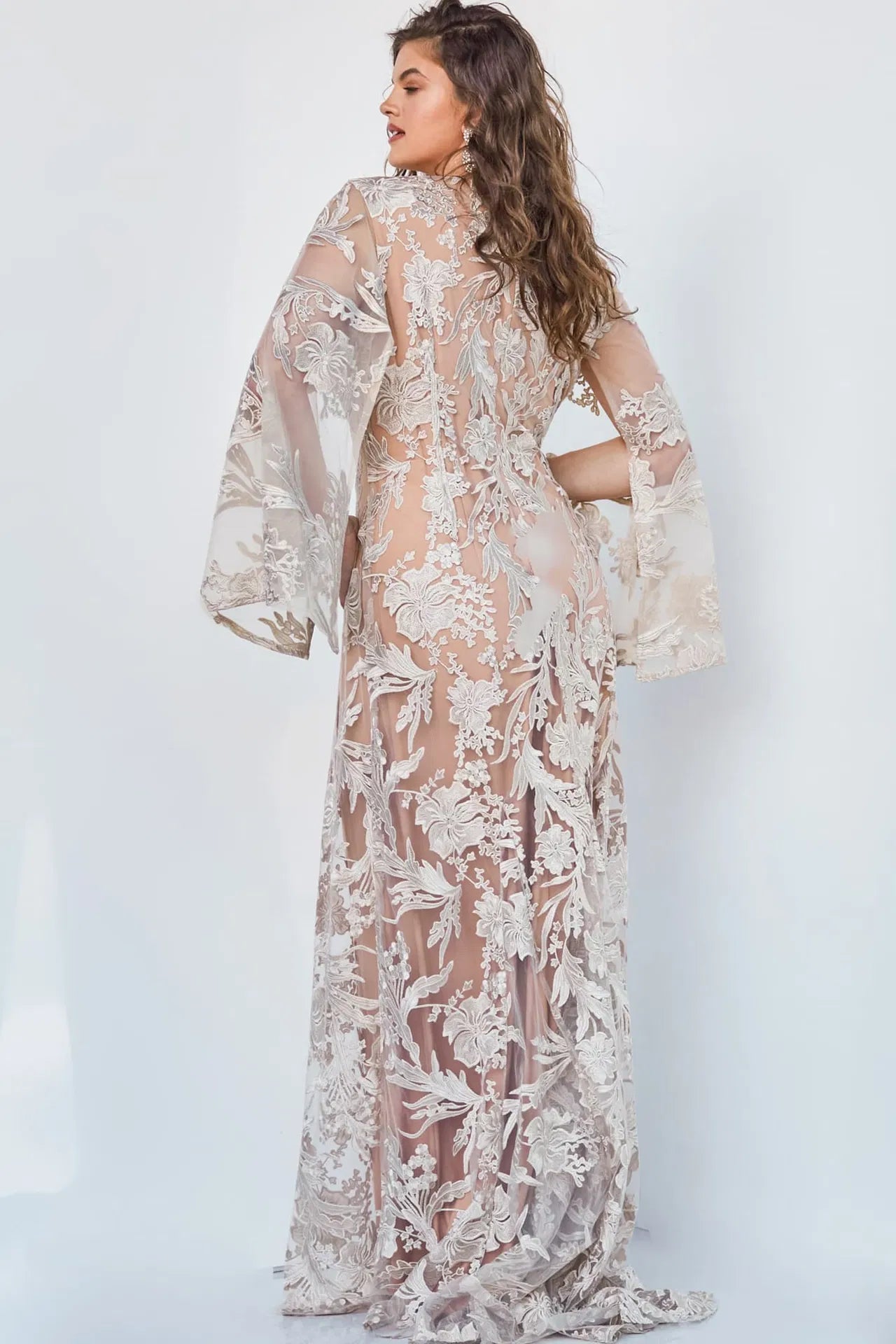You will truly shine in this tantalizingly elegant Jovani 00752 creation. Defines with a tailored nude lining, this beauty shows off a plunging v-neckline with scalloped edges. Draped with floral rendered novelty lace, the bodice is framed with long cape sleeves. A zipper closure accents the full back. Back godets grace the full-length sheath silhouette as it falls into a sweeping train. Make this night worth remembering with this Jovani masterpiece. Models are pictured wearing Champagne, and Navy/Nude variants of the dress.