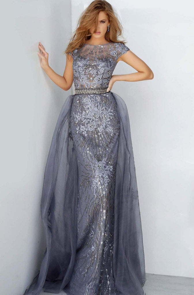 Get that royal look with this Jovani 02327. Featuring an illusion neckline, this cap-sleeved masterpiece is embellished with beads and stone accent on its sheer bodice, lace appliques, bejeweled waist, mid-open back, and a zipper closure. The bottom part is adorned with an A-line silhouette full over skirt, and a sweep train. You will definitely make a statement in every occasion.