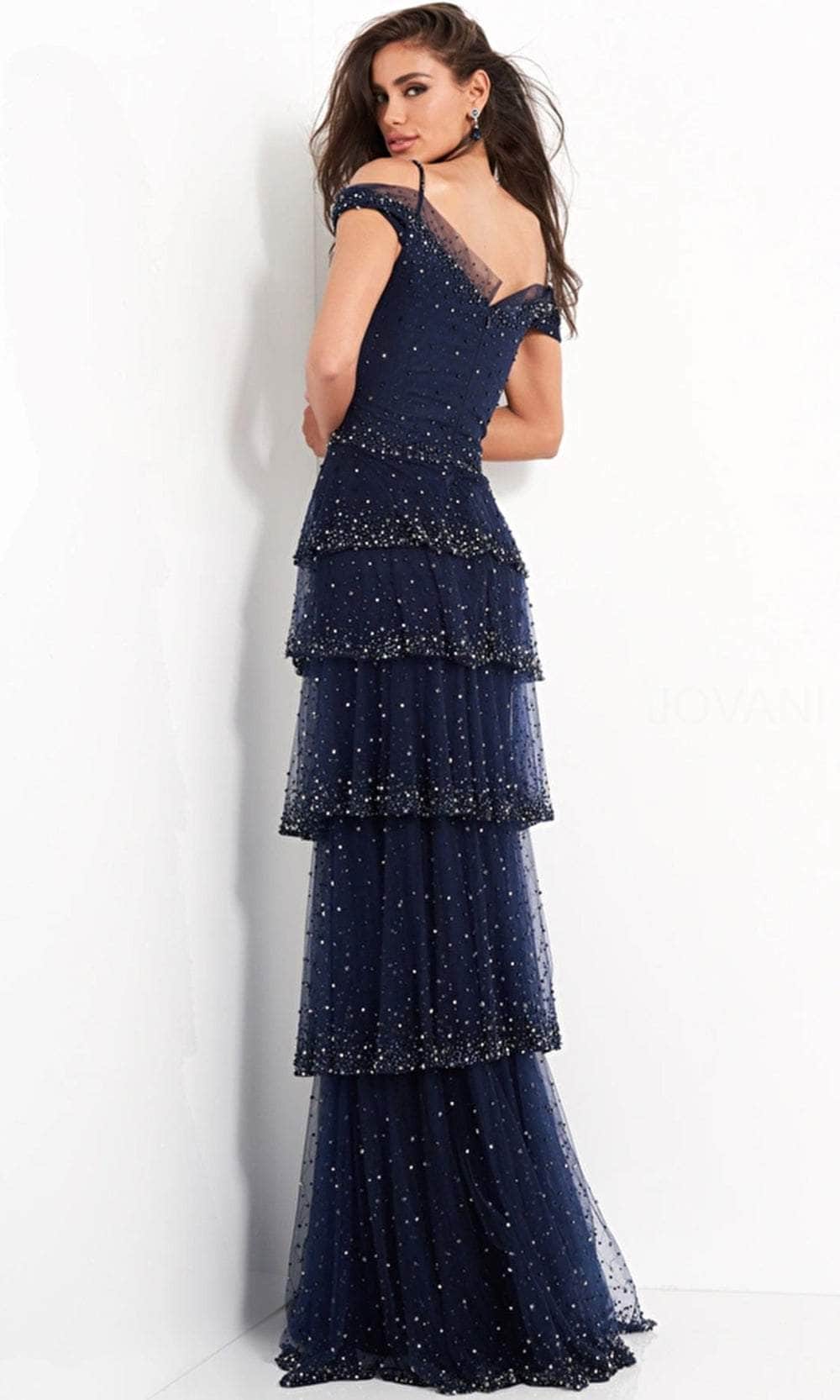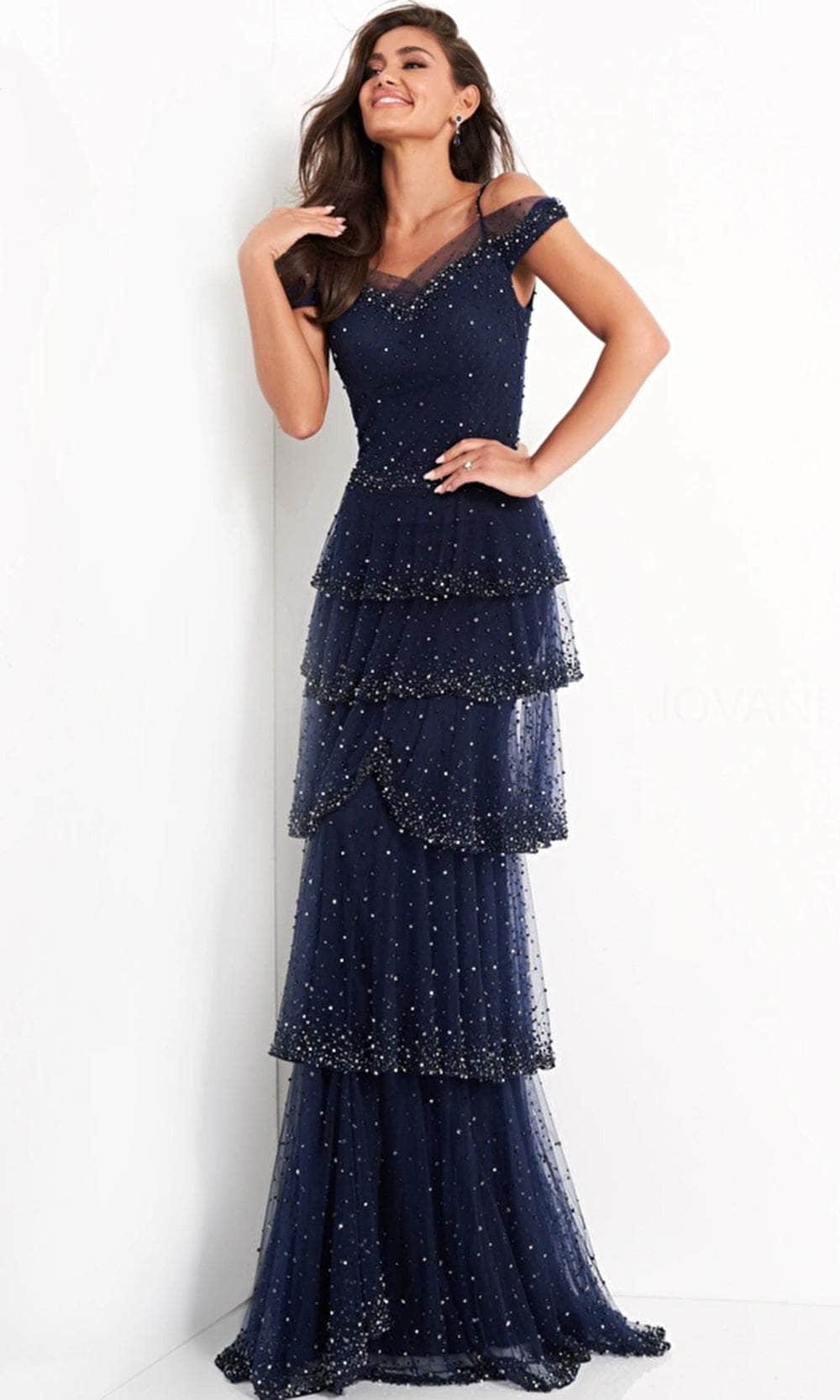 Bring a breathtaking new look to prom night in this stunning Jovani 04859 special occasion dress. This stunning evening gown has an illusion off-the-shoulder neckline and a column silhouette made of beaded net with cold shoulder straps to be extra stunning. The multi-tiered skirt, which has a belted waist, transitions to a short brush train at the end. Charm everyone from all angles as you shine all night long in this Jovani masterpiece! Model is wearing Navy color.