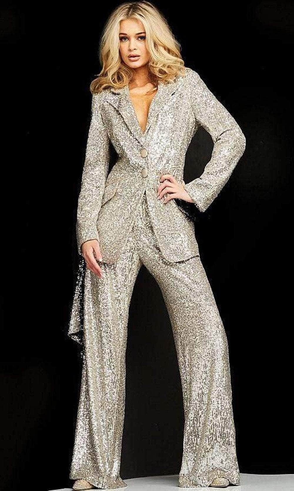 Exquisite charm emanates from every intricate detail of the Jovani 04904SC creation, creating an impeccable ensemble that leaves no room for imperfections. Be the shiniest of them all as you wear this metallic blazer. It features long sleeves and a sexy plunging collared neckline for the bodice. Pants not included. You will stun everyone with your grand entrance in this chic Jovani 04904SC masterpiece. Model is wearing the Nude/Silver color.