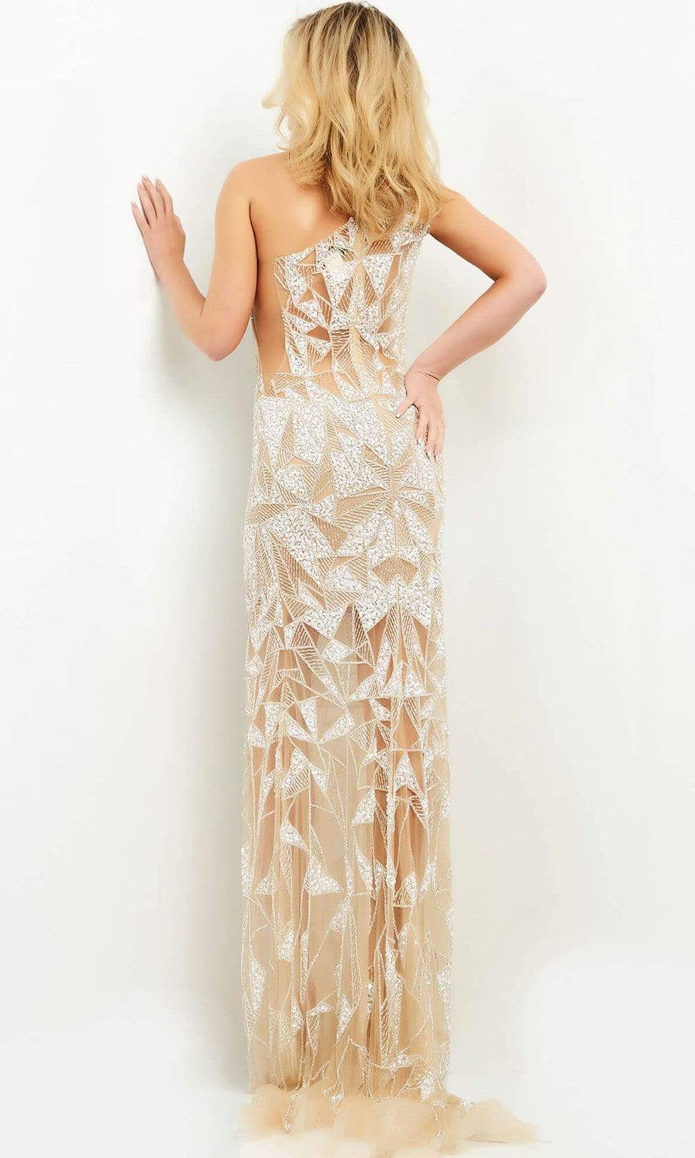 Flatter your figure in this form-fitting evening dress by Jovani 05873. The whole dress is fully embellished as the fitted bodice showcases an asymmetrical neckline and one shoulder strap. A side slit highlights the sheath skirt to perfectly elongate your sexy leg and finishes with a brush train. Have all eyes on you in this Jovani dress. Model is wearing the Nude color.