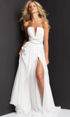 Cultivate a style that charms in this Jovani 05971 creation. Flatteringly textured with pleats on its strapless bodice, this piece has a low v-neckline with a low open back. Styled with a cross beaded strap on the midriff, the skirt opens with a slit and flares into a train. Be crowned as the style star in this Jovani masterpiece. Models are wearing the Off White and Orange colors.