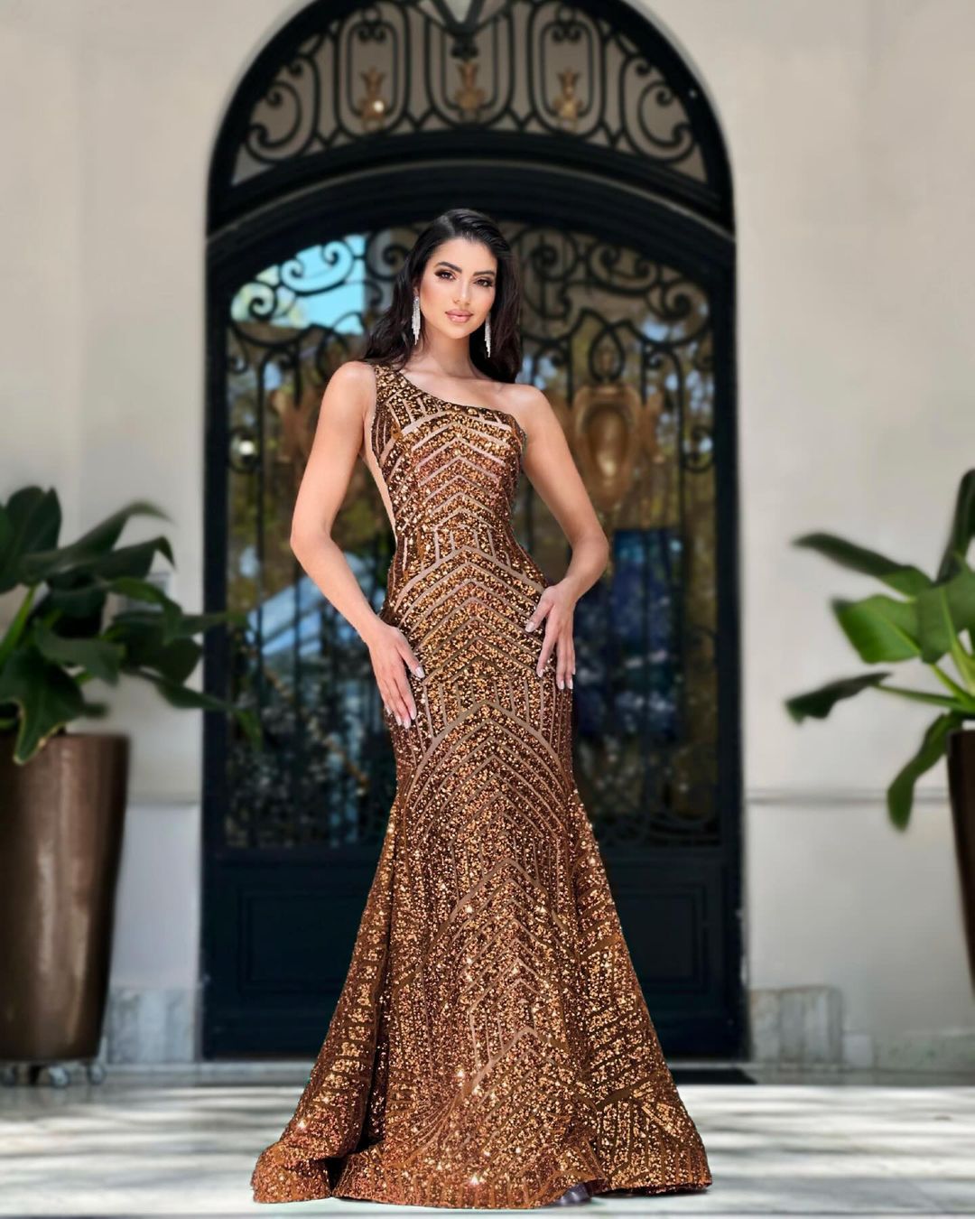 Details: Sleeveless, Geometric Sequins, Illusion Sides, Zipper Closure, Sweep Train, Open Back
