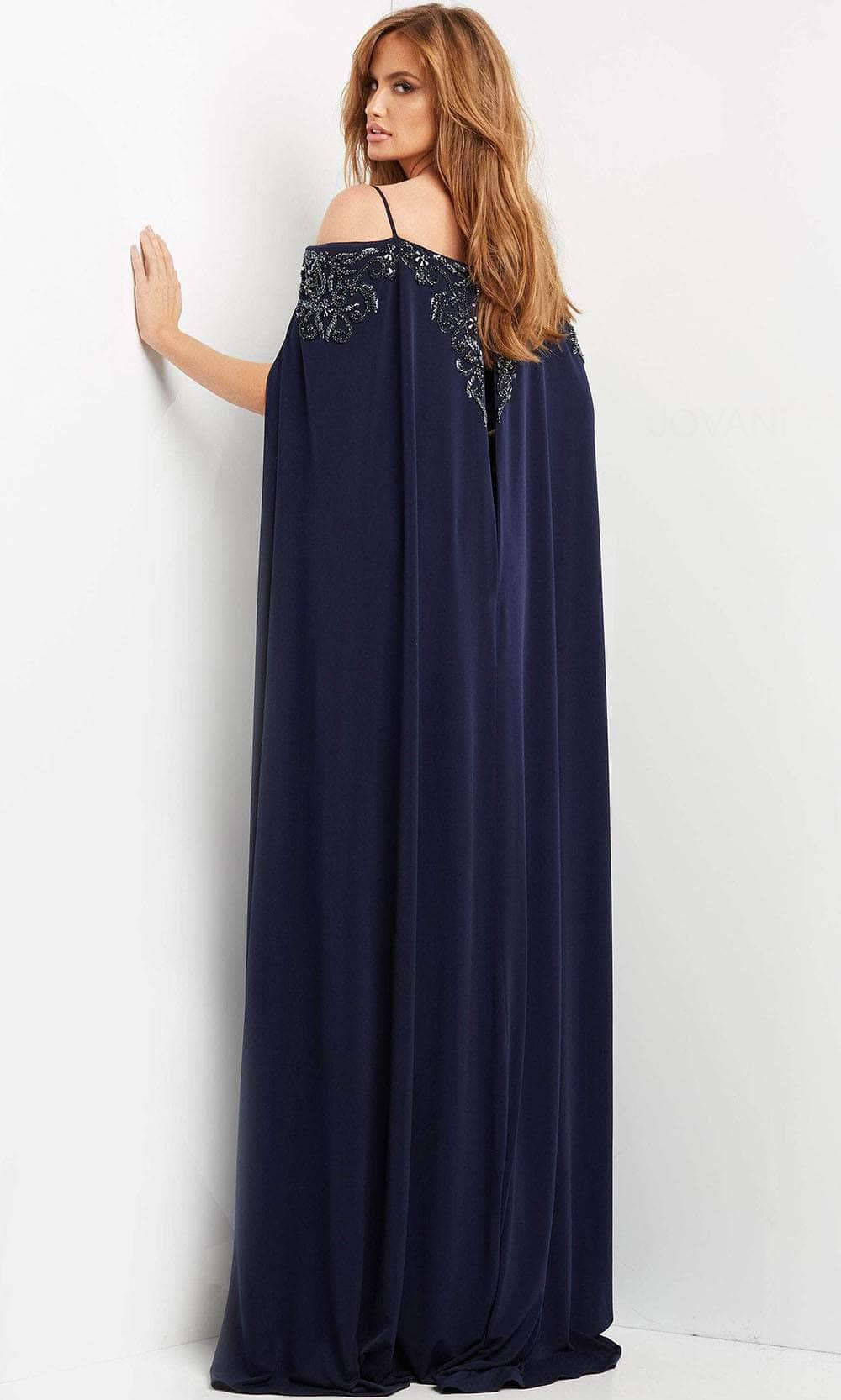 You are sure to make an entrance in this elegant evening gown from Jovani 06631. This beautiful ensemble features an off shoulder neckline with a V-shaped cut and a long cape accented with beadwork detail. This piece also comes with spaghetti straps that support the fitted bodice, while the mid-open back is secured by a zipper closure. The skirt forms a full length A-line silhouette with a sweep train finish. Capture the glamour as you walk on this stunning gorgeous Jovani masterpiece. Model is wearing the Navy color.