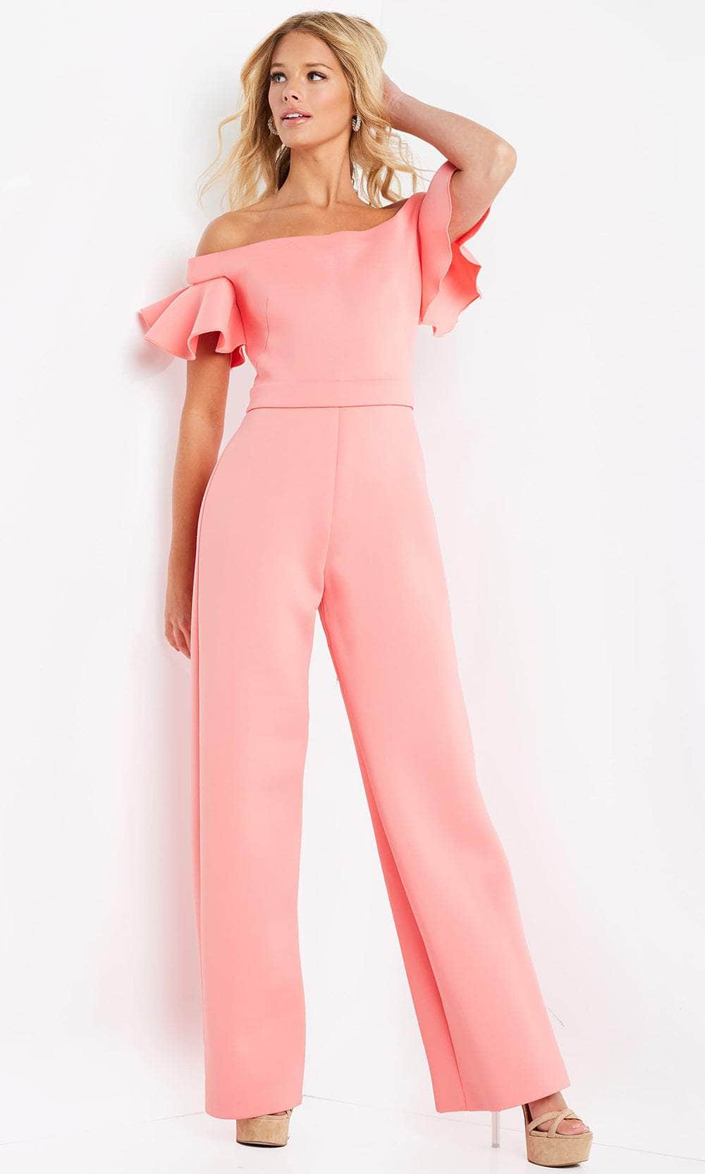 Start off the night in pure sophistication while in this elegantly made Jovani 06713 creation. Creatively styled with tailoring lines that parade the feminine form, this beauty shows off an off shoulder neckline paired with ruffled sleeve and a midrise styled back with a concealed zipper closure. Flatteringly nipped with a tonal band along the natural waist, this ensemble flatters with a pair of straight pants that complete its jumpsuit silhouette. Flourish a style that will make you stand out in this Jovani masterpiece. Model is wearing the Light Coral color.