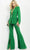 Be ready to fascinate everyone in this couture by Jovani 06922. This formal two piece jumpsuit features slit long sleeves and a collared V neckline. Pants is in full length and also has slit on both sides. Another great creation by Jovani. Model is wearing Emerald color.