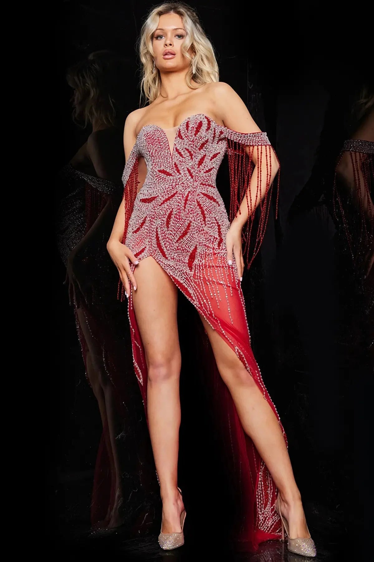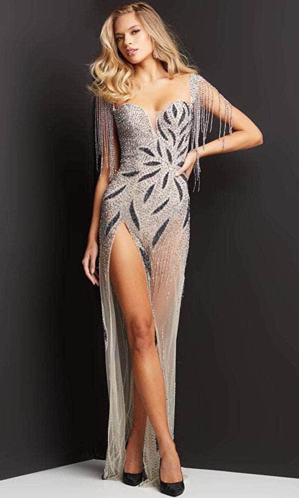 | Details: | Sleeveless, Beads, Fringes, Illusion panel, Sheer, Mid-open back, Zipper closure, High slit |