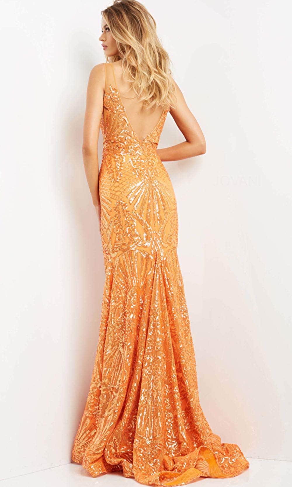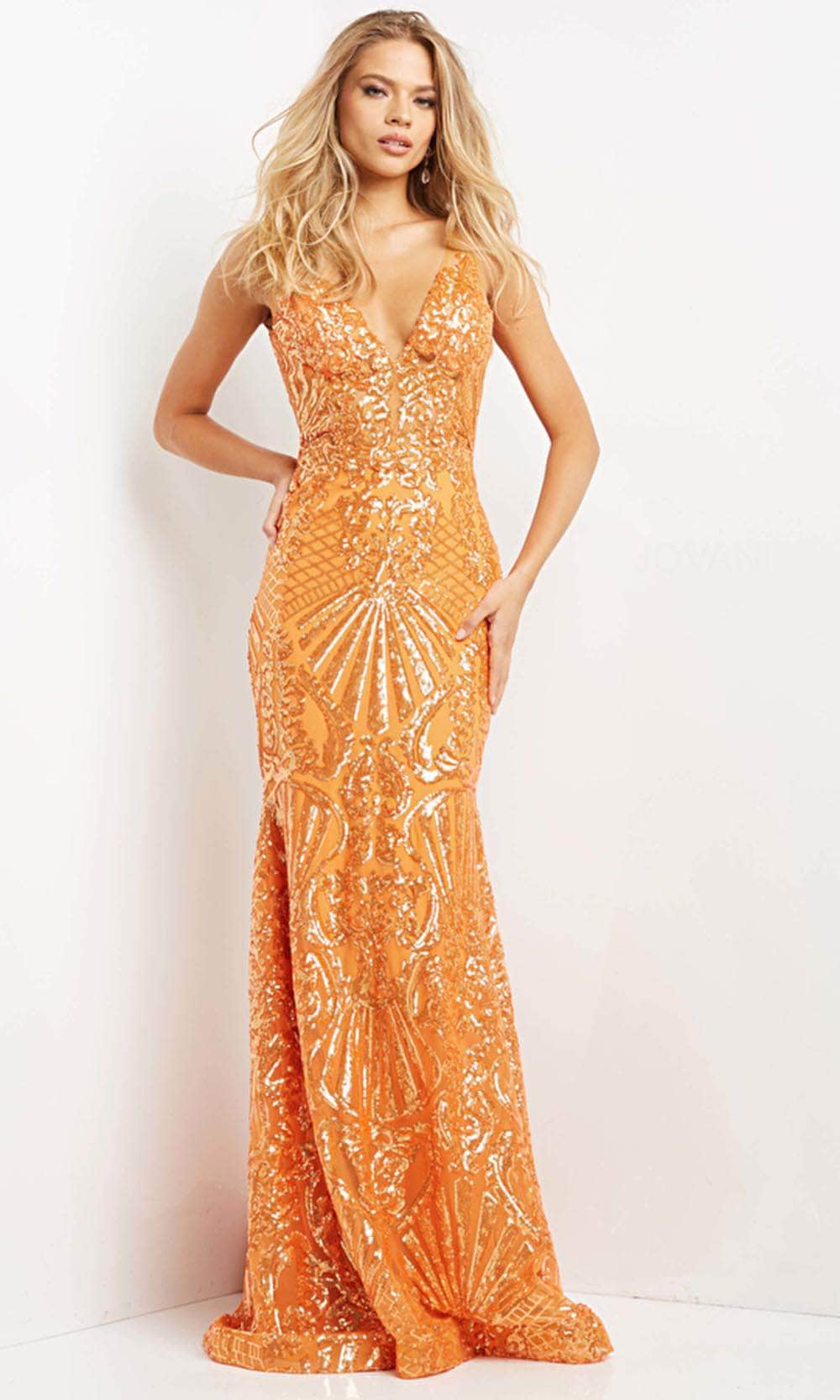 Be mesmerized with the style of this gown Jovani 07276. With sheer straps outlining the low V-neckline and open V-back, this dress has a slim-flare silhouette in patterned sequins. A fully lined skirt with side and back godets spills to a horsehair hem and sweep train, contrasting the semi-sheer bodice. Get ready for admiring glances with this Jovani masterpiece. Jovani offers sophisticated, sexy, fun, and glamorous dresses. From unique beading and detailed designs to sexy strapless gowns, classy lace dresses, and elegant halter necklines - Couture Candy have it all. Model is wearing Orange color.