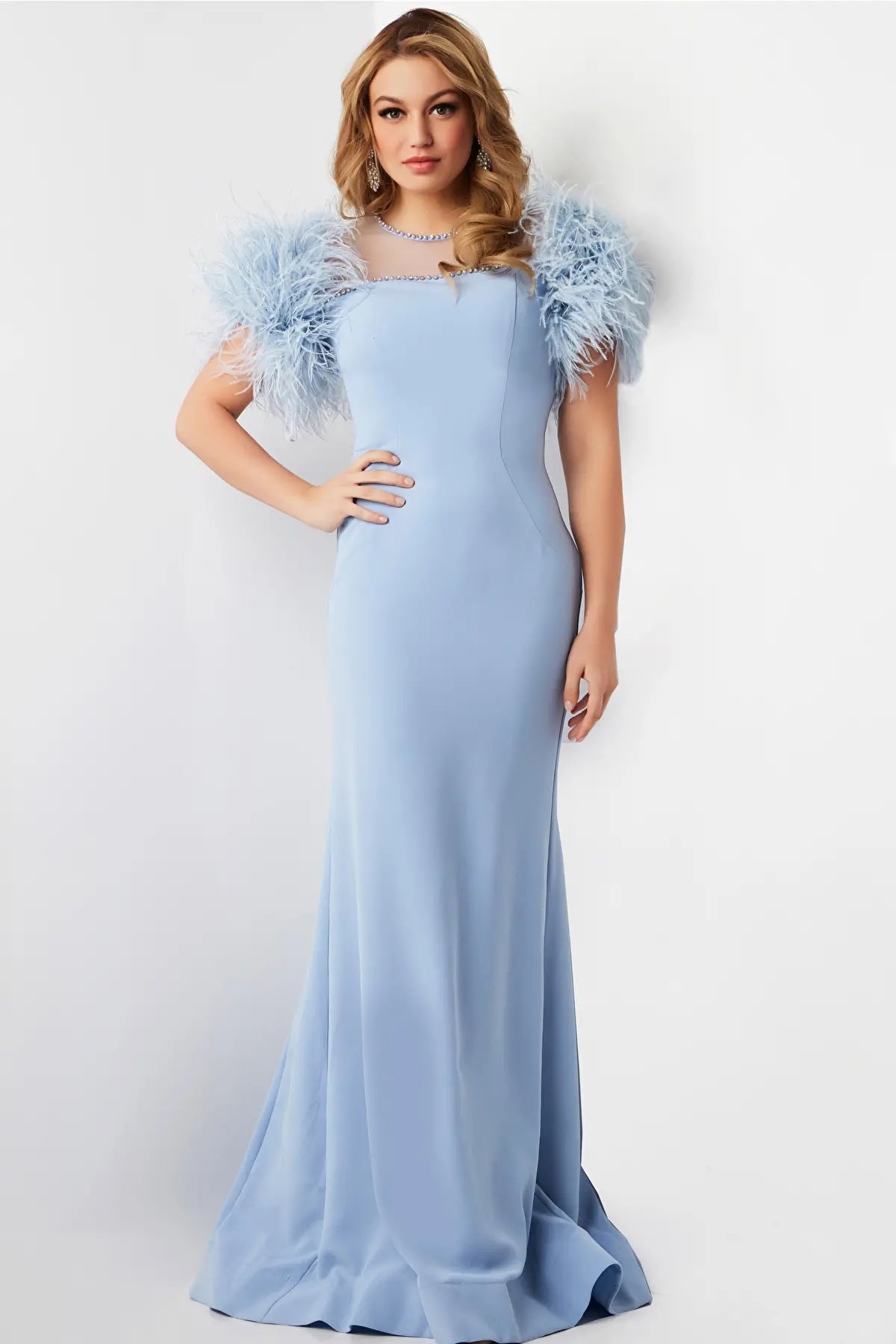 Appear in elegance on your next even with this classy and endearing Jovani 07432 evening dress. You will be adored in this sheath-silhouette dress which highlights an illusion jewel complemented by a short feather sleeves. Its neckline features beaded details which adds charms to the dress. The full back has sheer features similar to its front and enclosed with a back zipper which allows the dress to have a neat finish. Look fabulous all night long in this Jovani 07432 creation. Models are wearing the Navy, and Light-Blue variants.