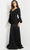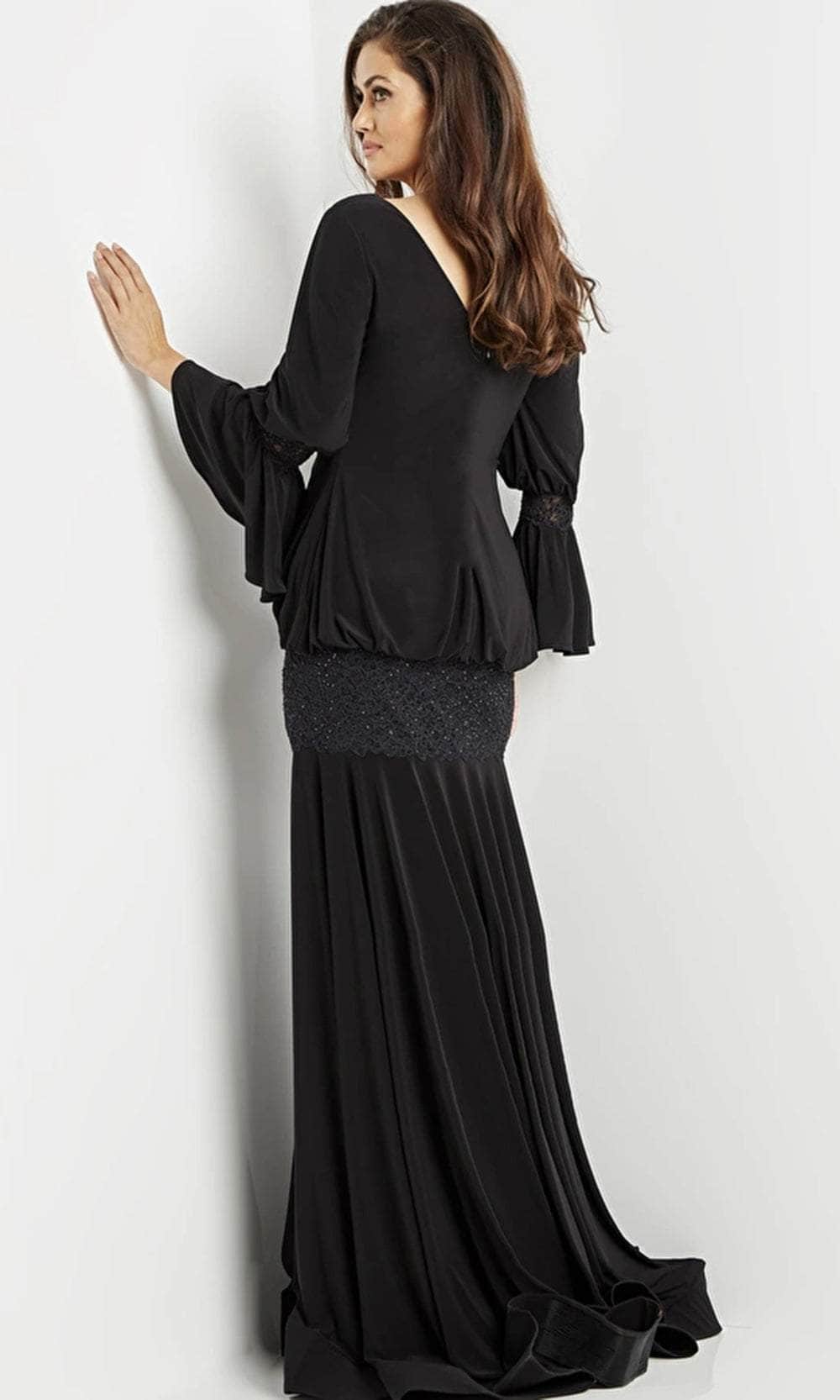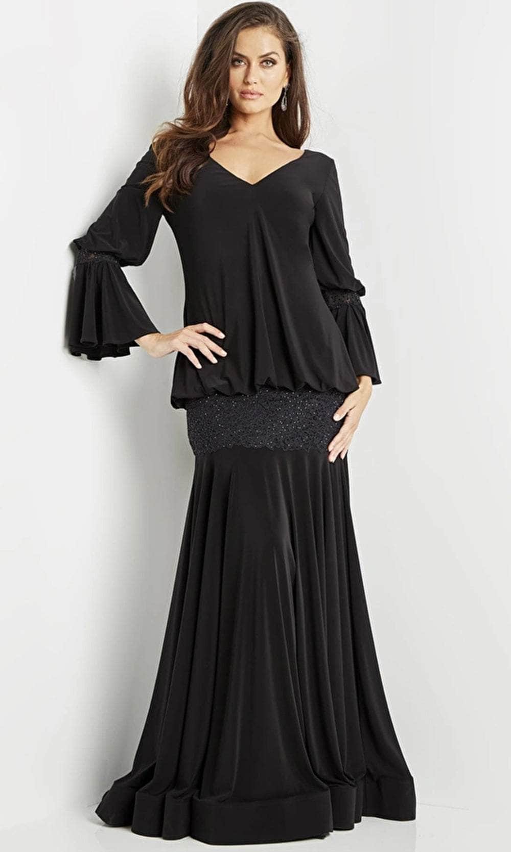 Exude a vintage appeal in this picture-perfect evening gown from Jovani 07811. Light up the night wearing this eye-catching gown featuring a V-neckline, V-shaped back, circular flounce long sleeves, and lace details below the waist. The whole outfit highlights the draped style, while the skirt flows down to the floor-length hem. Expect to be turning heads as you walk into your special event wearing this creatively romantic gown by Jovani. Model is wearing Black color.