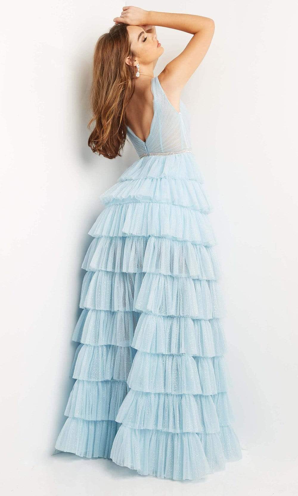 Every detail of this Jovani 07998 is dripping with faultless charm. The fitted bodice showcases a sleeveless and surplice V-neckline, V-open back and zipper closure. The waist is accented with a beaded embellished belt and the skirt features a layered and pleated A-line silhouette that finishes to a floor-length hemline. This Jovani masterpiece will absolutely make you feel special! Model is wearing Sky Blue color.