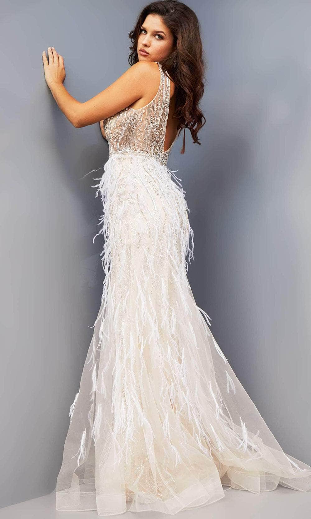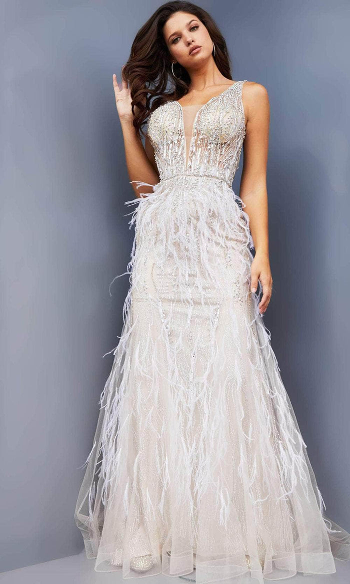 Unveil that inner diva in you when you flourish this impressive Jovani 08144 creation. Sculpted with tailoring seams and embellished with a pattern of sequins, this gown parades a plunging v-neckline and an illusion modesty inset. Flaunting a sheer bodice and an illusion v-open back, ostrich feathers spill along with the beadwork as they grace the gossamer rendered skirt down to its sweeping denouement. Steal the show when you saunter into the ball in this Jovani masterpiece. Models are wearing the Lilac and Beige color. Find more Jovani Dresses.