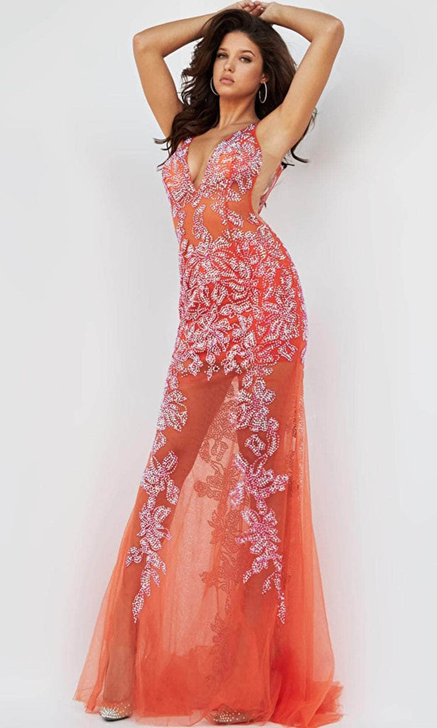 Be a vamp in an alluring creation by Jovani 08275. Sleek and sexy, this dress exudes pageantry vibe with its sheer fabric festooned with sparkling beads which adds interest to your assets. Features a plunging neckline, deep side cutouts, and open back style which shows-off your skin. The sheath skirt cascades to a sweeping train while the short skirt serves as your lining. Be madly in love with the sensual appeal of this Jovani masterpiece. Model is wearing the Tangerine color.