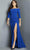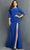 Start your night out right with a stylish creation from Jovani 08378. The lovely form-fitting dress is tailored with clean seams. It highlights an off-shoulder bodice with a straight-across neckline, complemented by a mid-open back. The fitted skirt is accentuated with draping accents and cascades down to a floor-length sheath silhouette finished off with a sweeping train and 3/4 sleeves that add flair to this beauty. Unleash an inner glamour that attracts all eyes to you in this Jovani masterpiece. Model is wearing Royal color.