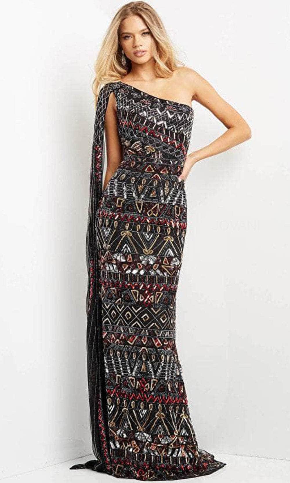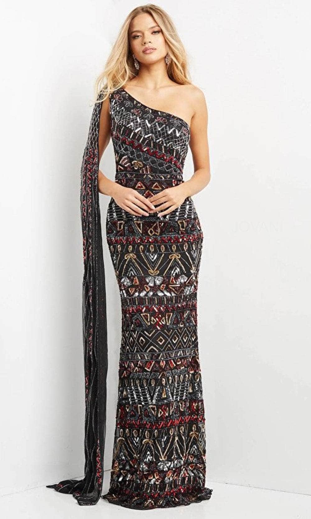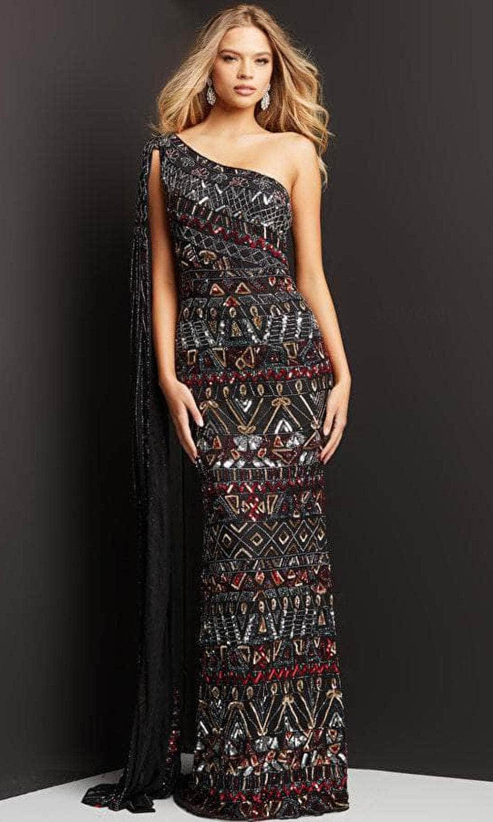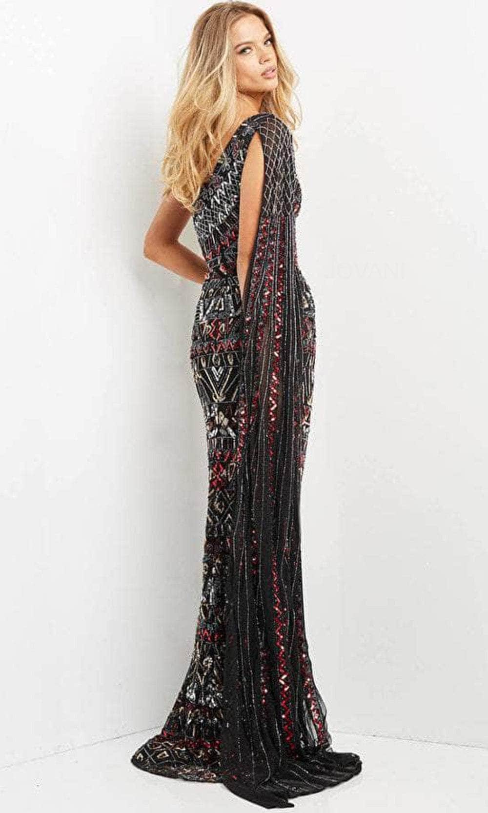 Look your absolute best and create a night that you will never forget wearing this Jovani 08450. Intricately adorned with sequins and beads all throughout, this stellar piece features a fitted bodice with an asymmetrical neckline, supported with a single shoulder strap with a fully embellished shoulder cape. The skirt smoothly clings to the hips as it beautifully cascades to the floor, completed with a brush of train. Everyone who sees you will be left speechless and giddy in this Jovani creation. Model is wearing Black/Multi color. Find more Jovani Dresses.