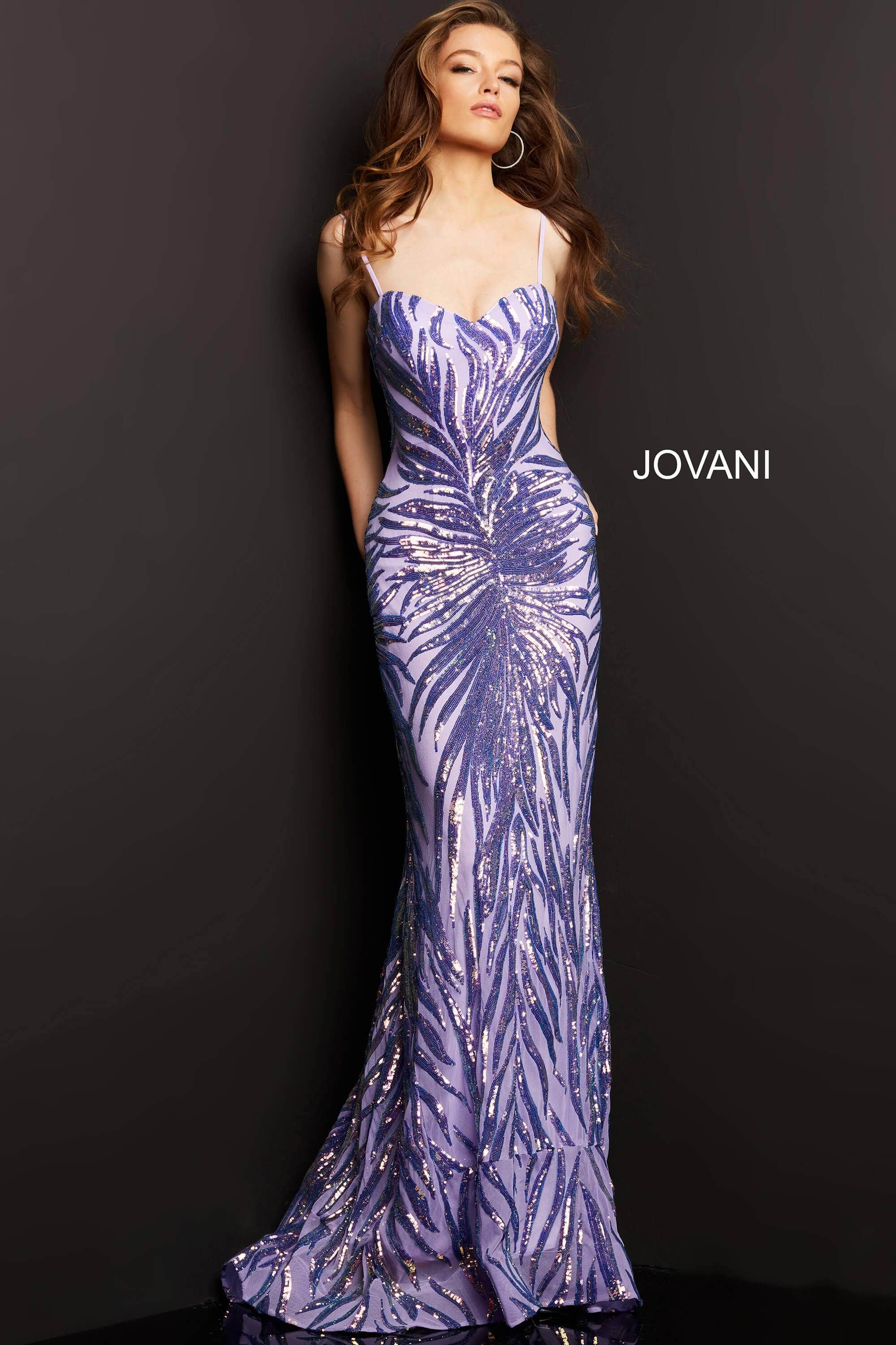 Radiate a chic yet effortless style in this Jovani 08481 creation. Embellished with patterned sequins, this fitted stunner creates a sweetheart neckline. Straps string into a lace up tie back. The skirt streams to pool into a train. Dazzle everyone with this Jovani masterpiece. Models are wearing the Red, Iridescent Blue, Iridescent Purple, and Neon Pink colors. Find more Jovani Dresses.