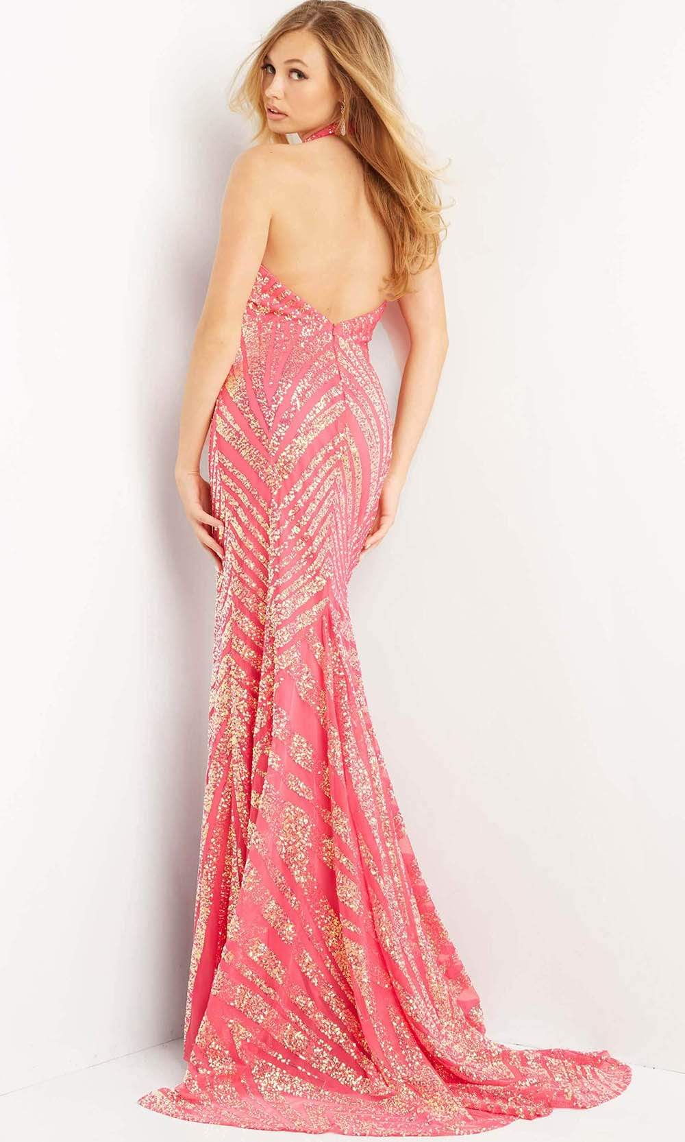 Turn yourself into a head-turning beauty by slipping into this absolutely eye-catching Jovani 08553 masterpiece. This embellishment makes a statement in a sleeveless, deep halter V-neckline and low open back with a fitted bodice. The full-length skirt is complemented with a detachable overskirt and with a thigh-high slit to perfectly elongate your sexy leg and finish with a sweep train. Clothe yourself in an alluring perfection that would capture a fairy tale you are dreaming of in this Jovani creation. Model is wearing an Iridescent Fuchsia color.