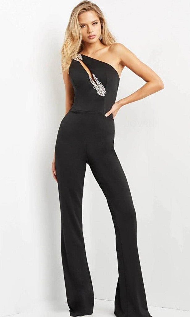 Capture that striking presence and get everyone’s attention in this Jovani 09019 creation. Tailored with visible seams and a sleek design, this beauty displays asymmetric neckline with paralleled cutout and accented by sparkling embellishments. This ensemble flatters the asset effortlessly and offers a mid-open back with zipper closure. It features a long leg flared pants that compliments the simplicity of the suit. This Jovani collection is a brilliant pick for any special party. Model is wearing Black color.
