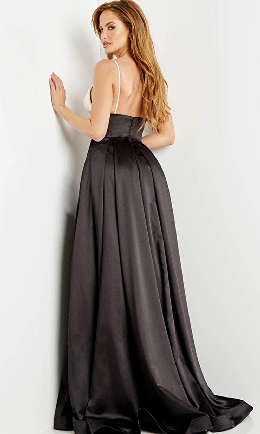Have an enchanted evening at the ball in this gorgeous gown from Jovani 09055! This dress showcases a sleeveless V-neckline with spaghetti straps. This high-waisted dress has a pleated skirt with a slit and a train that flares down to the floor, while the back is fastened with a back zipper closure with hook and eye closure. Exude a vintage appeal in this picture-perfect dress from Jovani. Model is wearing an Off White Black color.