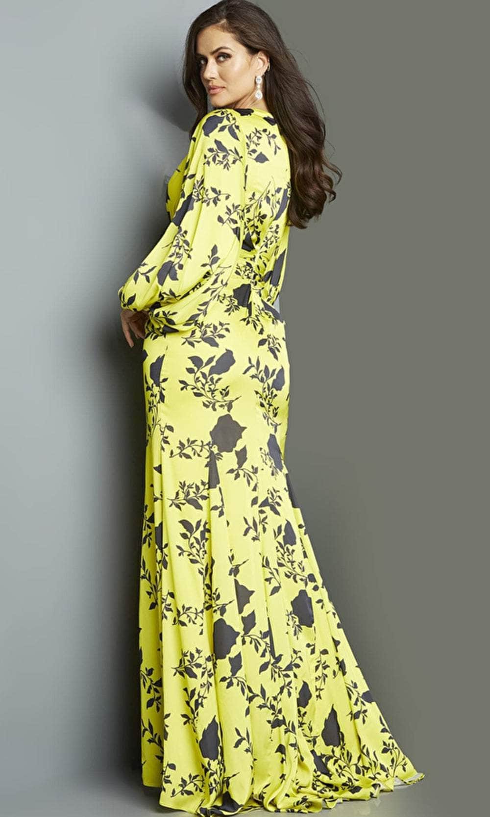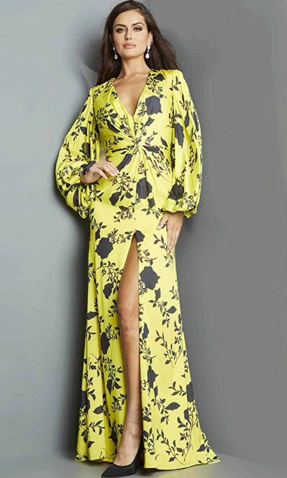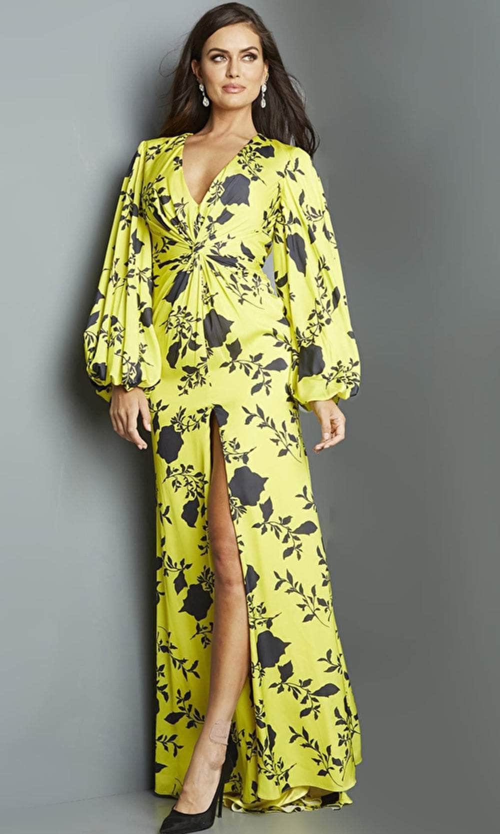Be ready to awe the crowd wearing this elegant evening dress from Jovani 09453SC. This elegant gown has a center-front split, bishop sleeves, a V-neckline, and a fit and flare silhouette in satin with a floral design. This stylish evening gown, which has back godets and a sweep train, is enhanced by the knotted ruched midriff. Exude a chic look as you make a captivating entrance and stand out with beauty in this Jovani 09453SC floral dress! Model is wearing Yellow/Black