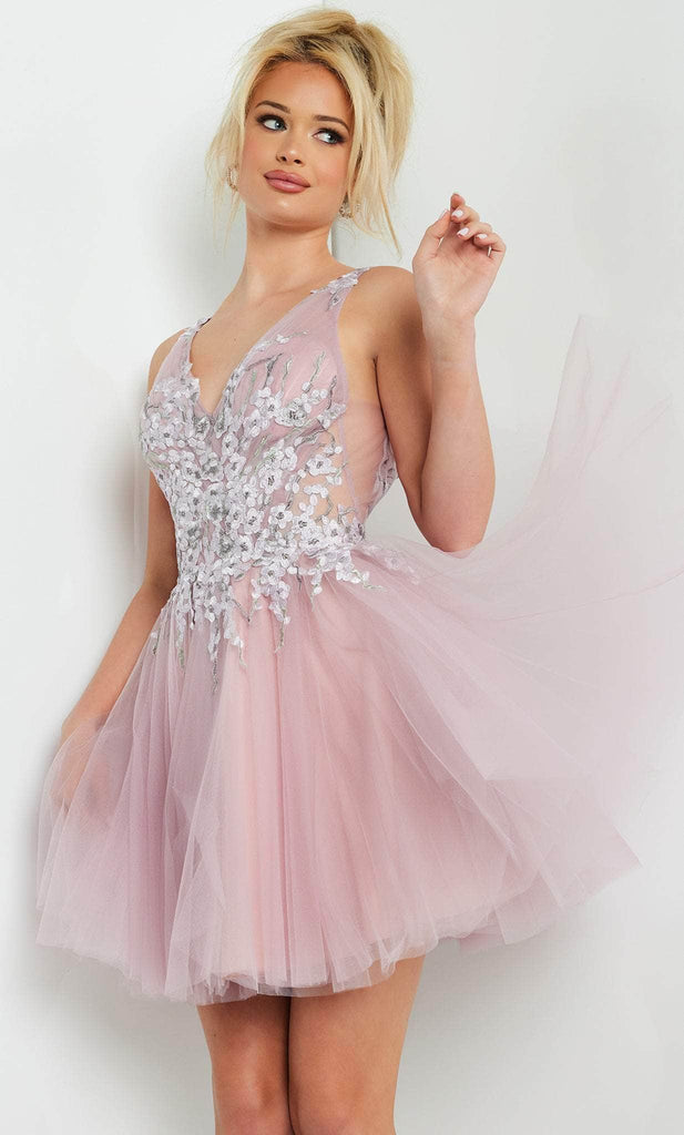Look amazing for the party in this creation by Jovani 09518. Ornamented with lovely floral embroidery on the illusion top bodice, this piece exudes beauty and magnetism. A pair of wide shoulder straps are used to support the plunging v-neckline and deep v-open back. Layers of tulle fashion a voluminous A-line skirt that trickles to the mid-thigh hemline. Feel dainty and feminine in this enchantingly designed Jovani 09518 cocktail dress. Model is wearing the Mauve color.