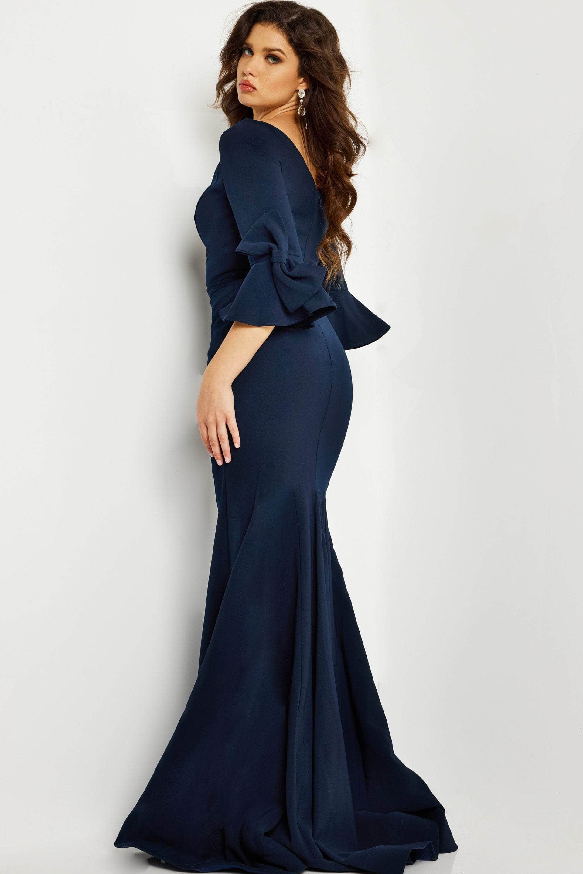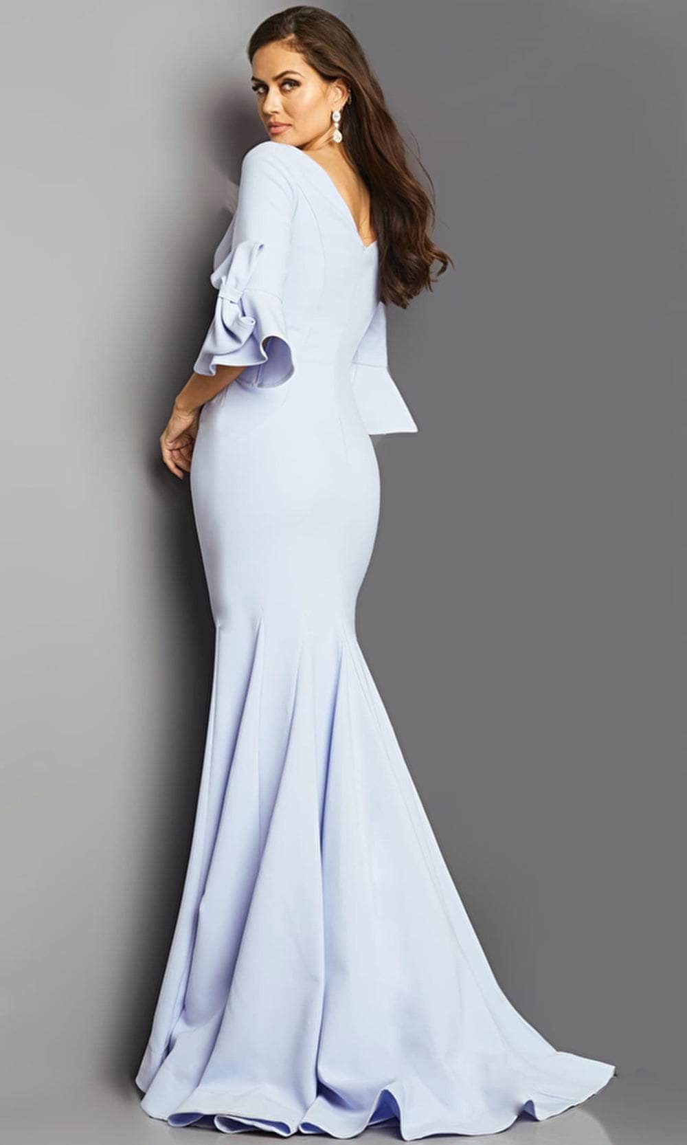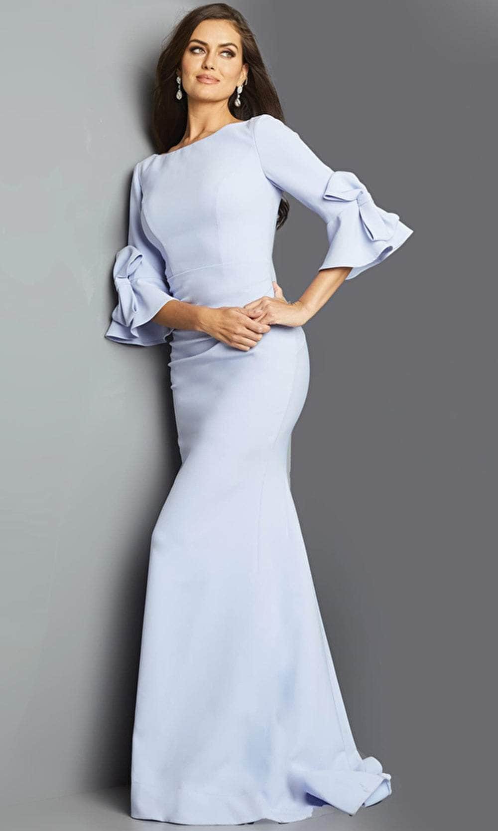 Wrap up in this winning style for the evening by Jovani 09776. Crafted with clean seams and tailored from stretch crepe fabric, this evening dress features a bateau neckline on a fitted bodice framed by quarter bell sleeves for an elegant appeal. Styled with a V-shape back and secured with a back zipper closure. The full-length hemline of the sheath skirt flows into a sweep train. This Jovani masterpiece is designed with sophistication in mind.