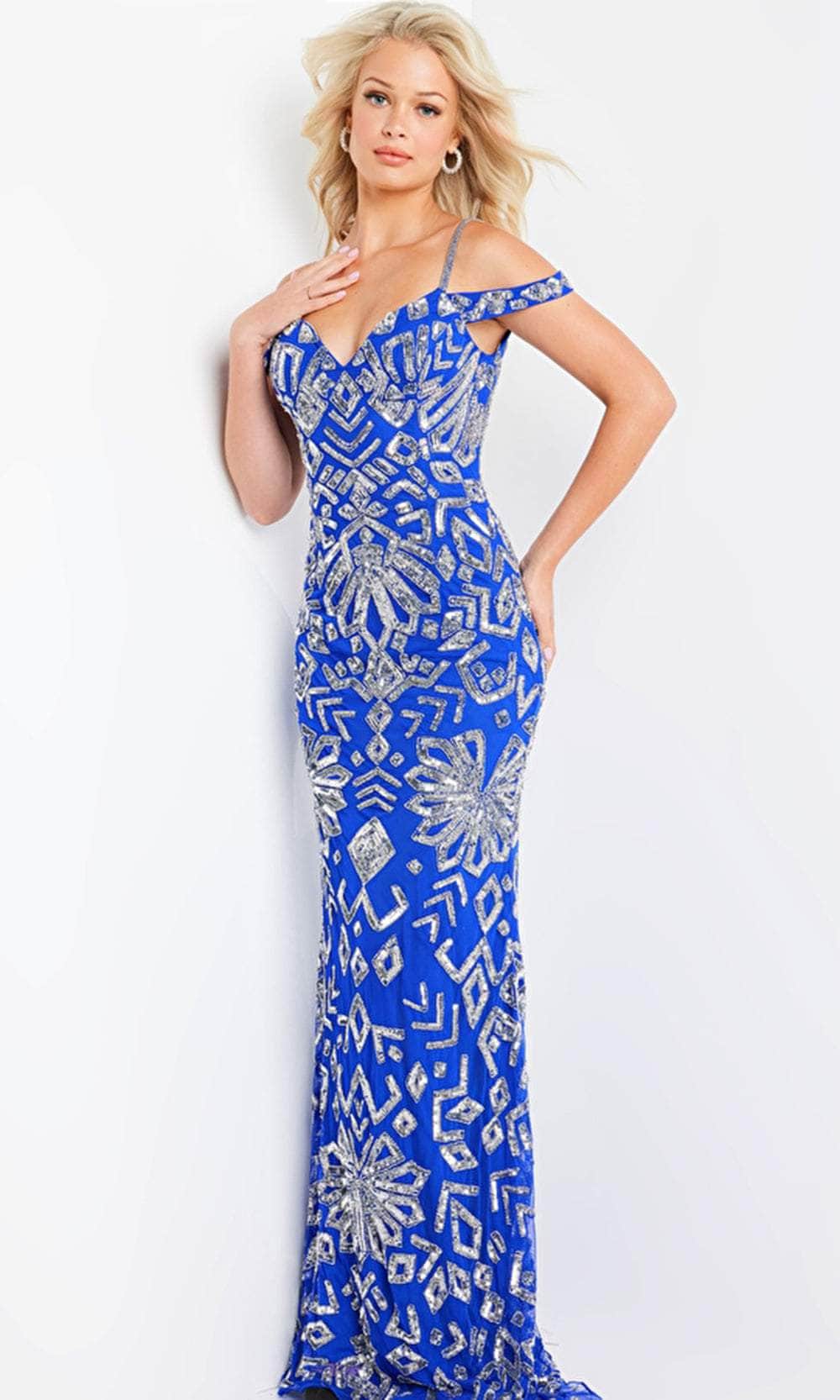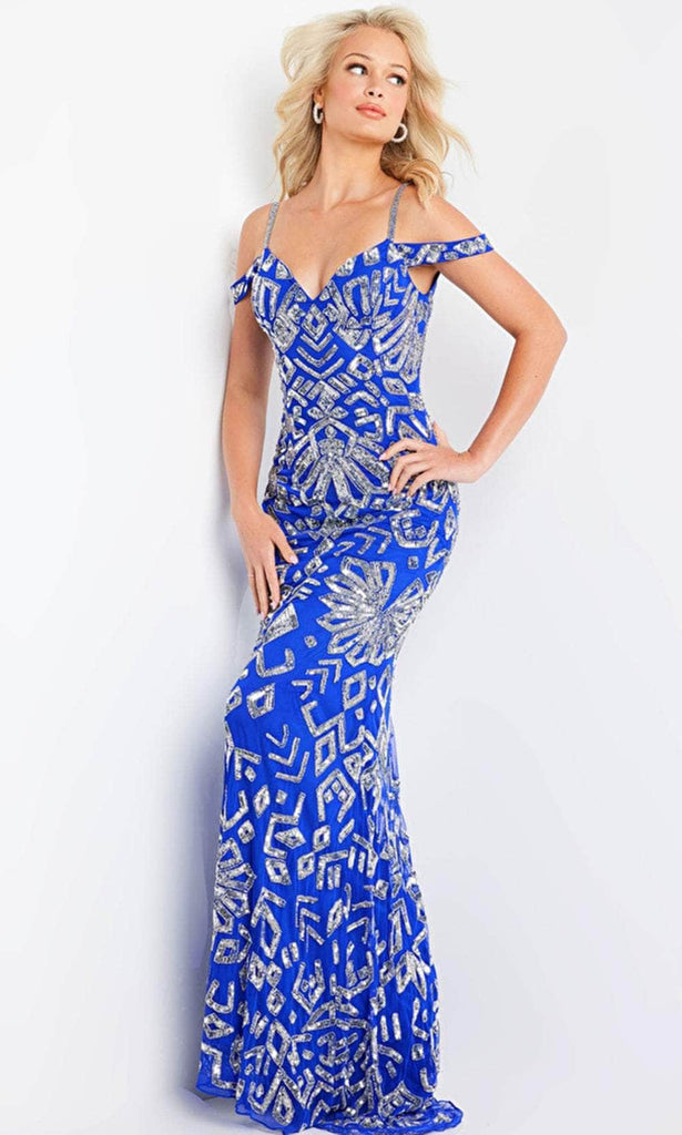 Get ready to be captured in a picture of sophistication in this evening dress by Jovani 09905 creation. Be ready to sparkle in style wearing this garment that is fully embellished with silver sequins in an intricate pattern and boasts an off-shoulder neckline with beaded straps. This piece has an open back, while the sheath skirt ends in a floor-length hemline. Surround yourself in limelight with this illustrious evening dress by Jovani 09905 creation. The model is wearing a Royal color.