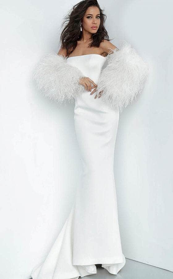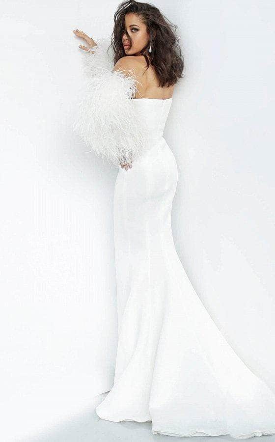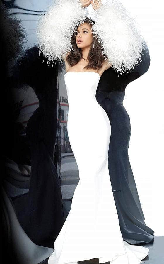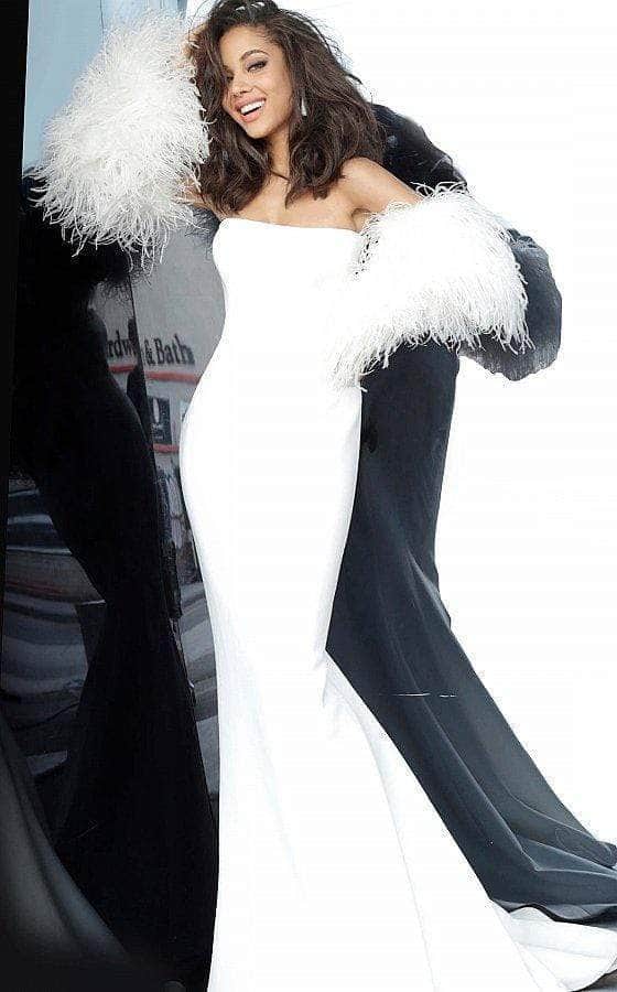 Look like perfection from every angle in this dazzling dress by Jovani 1226SC. This stretch scuba dress makes a statement in a strapless, straight-across neckline with feathered sleeves. The fitted bodice has a back zipper closure and from the waist trends a trumpet skirt with a sweep train finish. Have all eyes on you when you slip on this Jovani 1226SC masterpiece. Model is wearing White color.