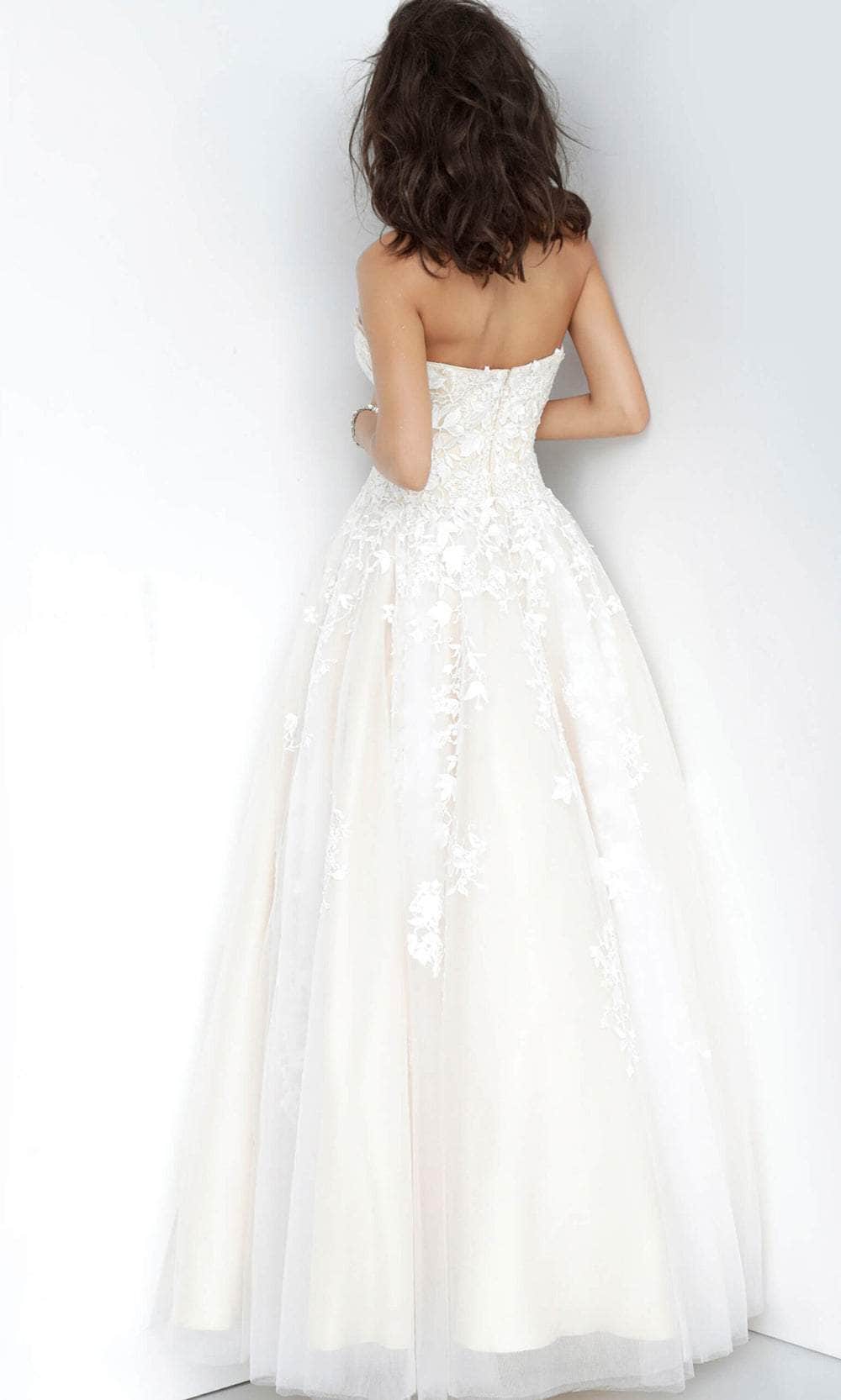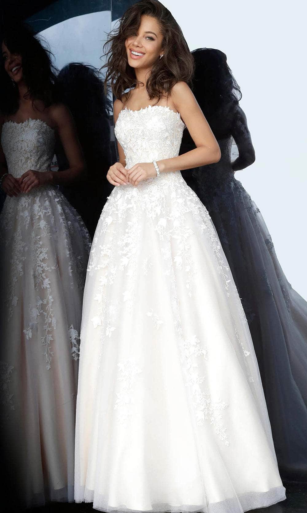| Details: | Strapless, Rosette Details, Lace Appliques, Embroidered Details, Layered Skirt, Sweep Train |