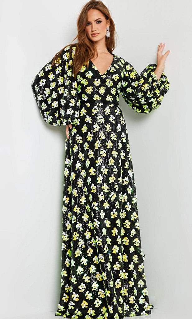 Dare to express yourself in the brazen design of Jovani 220770 to steal the show. The translucent fabric with its elaborate decorations gives off an otherworldly and alluring vibe. The hanging beads give the outfit a sense of motion and shine by catching the light as you walk. The long sleeves and closed back design give you a little extra coverage without being too much. The V-neckline and sheath silhouette of this dress are both figure-flattering and attractive. Walk in a defined sophistication and beauty wearing Jovani 220770. Model is wearing Black/Multi color.
