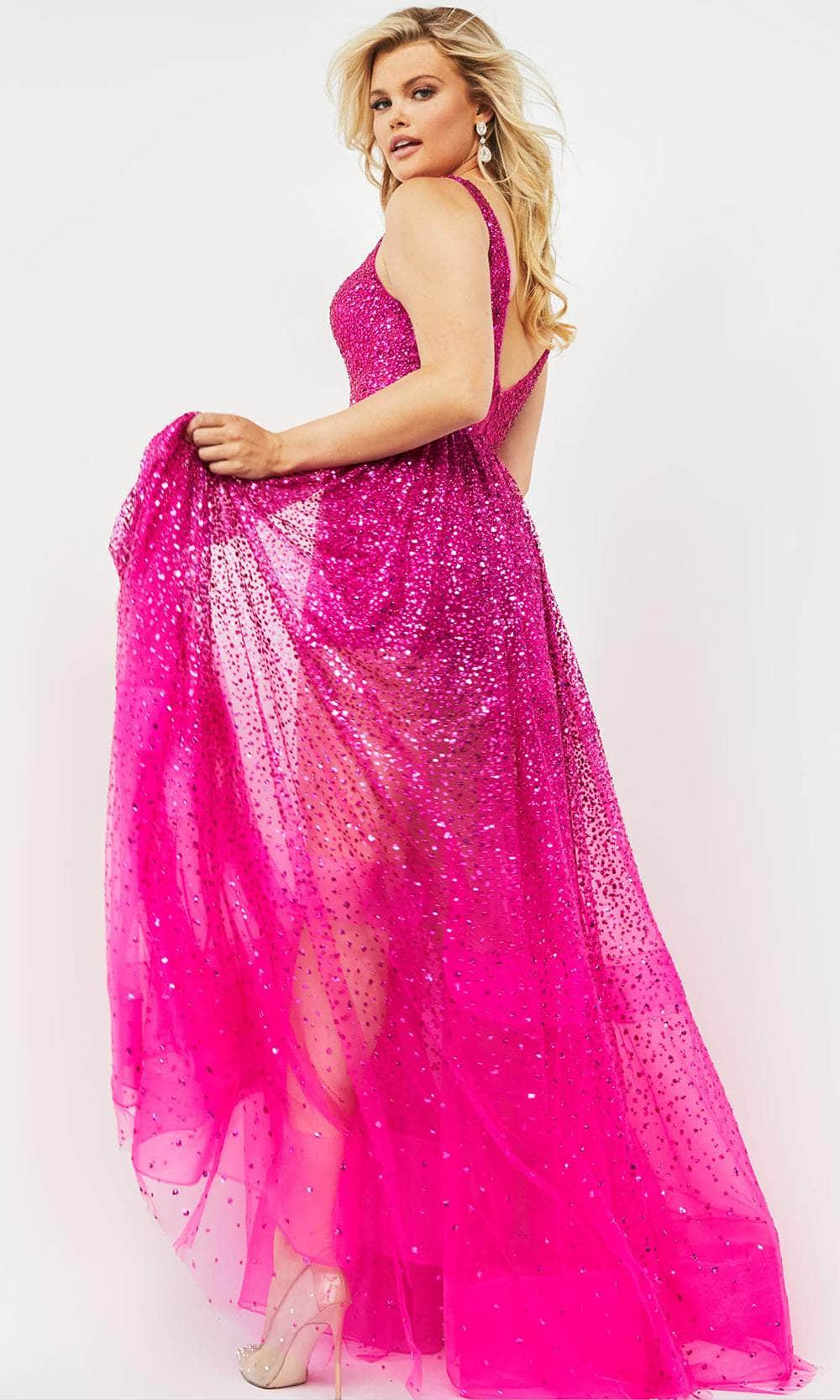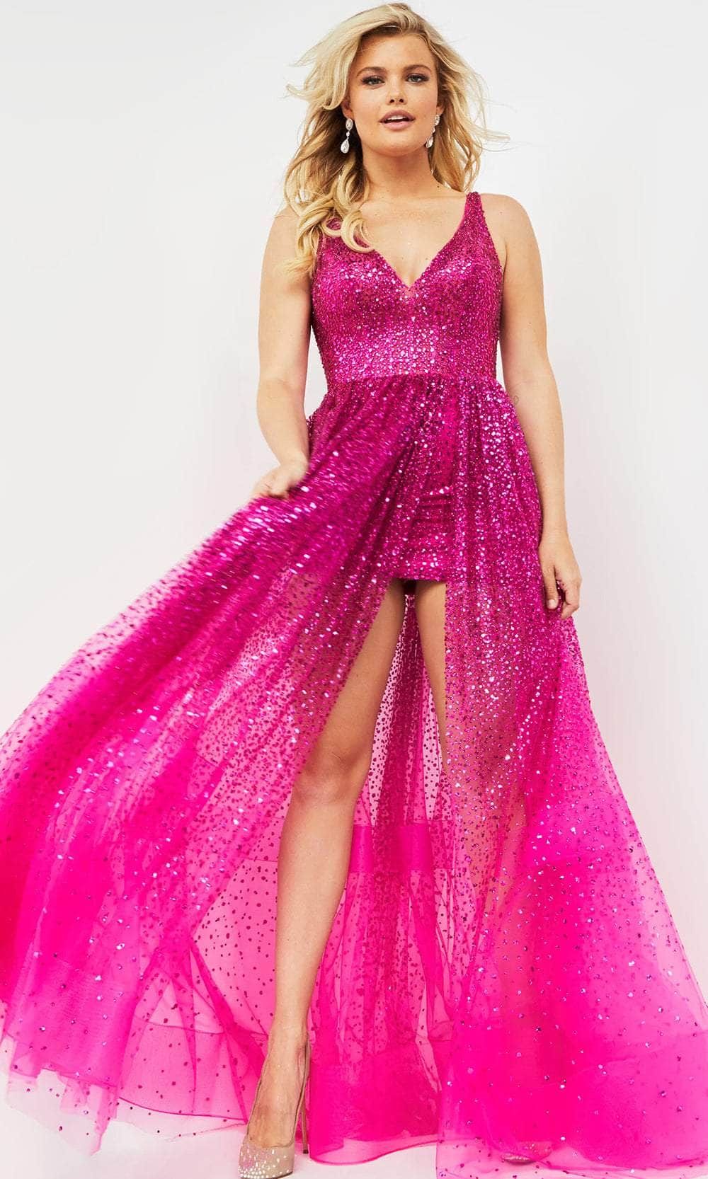 Look and feel like an ethereal vision as you cross the threshold of that stunning event in this Jovani 22391 creation. Crafted with a gossamer silhouette rendered with glitter dotted motif, this stylish piece flaunts a sleeveless bodice with a v-neckline. Dominated with a deep v-styled back and a zipper closure, the skirt forms a mini sheath detail. A gossamer overskirt wraps the waist as it cascades to the floor with a train. Be destined to spark interest on the dance floor in this Jovani masterpiece. Models are wearing the Fuchsia and Light-Blue colors.