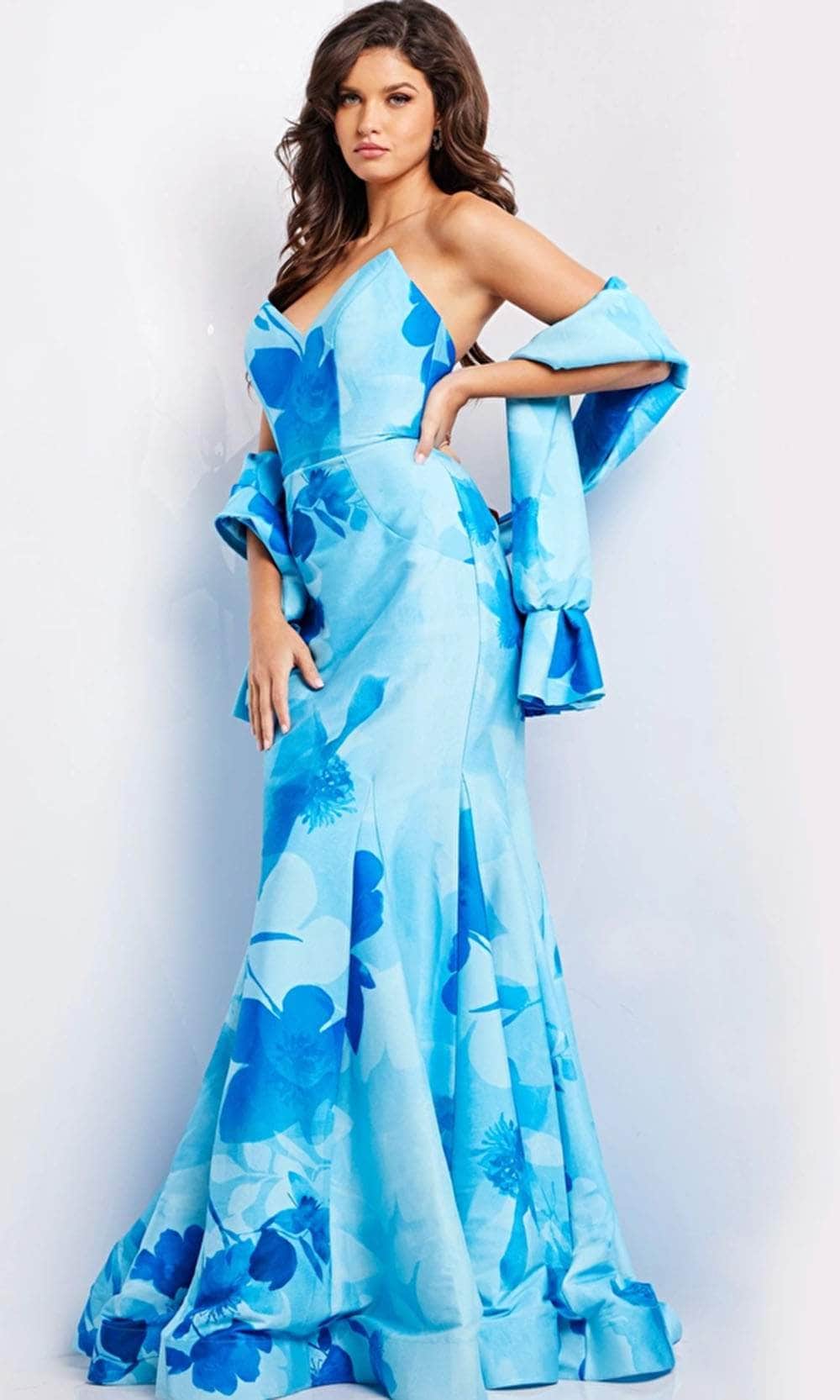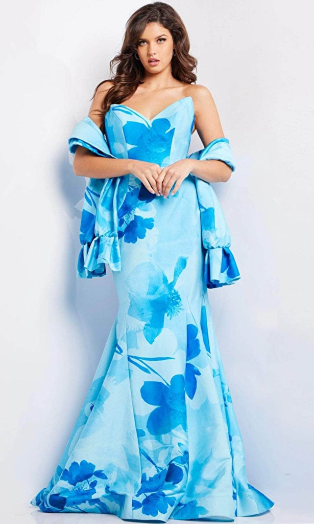 Showcase your vibrant and pleasant personality in Jovani 22706, a prom dress tailored from floral printed fabric. The strapless bodice, impeccably crafted with clean seams, showcases a V-neckline for a touch of sophistication. The floor-length mermaid silhouette skirt gracefully flows, enhanced with a horsehair trim that adds a hint of drama. Jovani 22706 is a flawless blend of timeless elegance and modern charm, ensuring you leave a lasting impression at any prom or special occasion. Model is wearing Blue color.